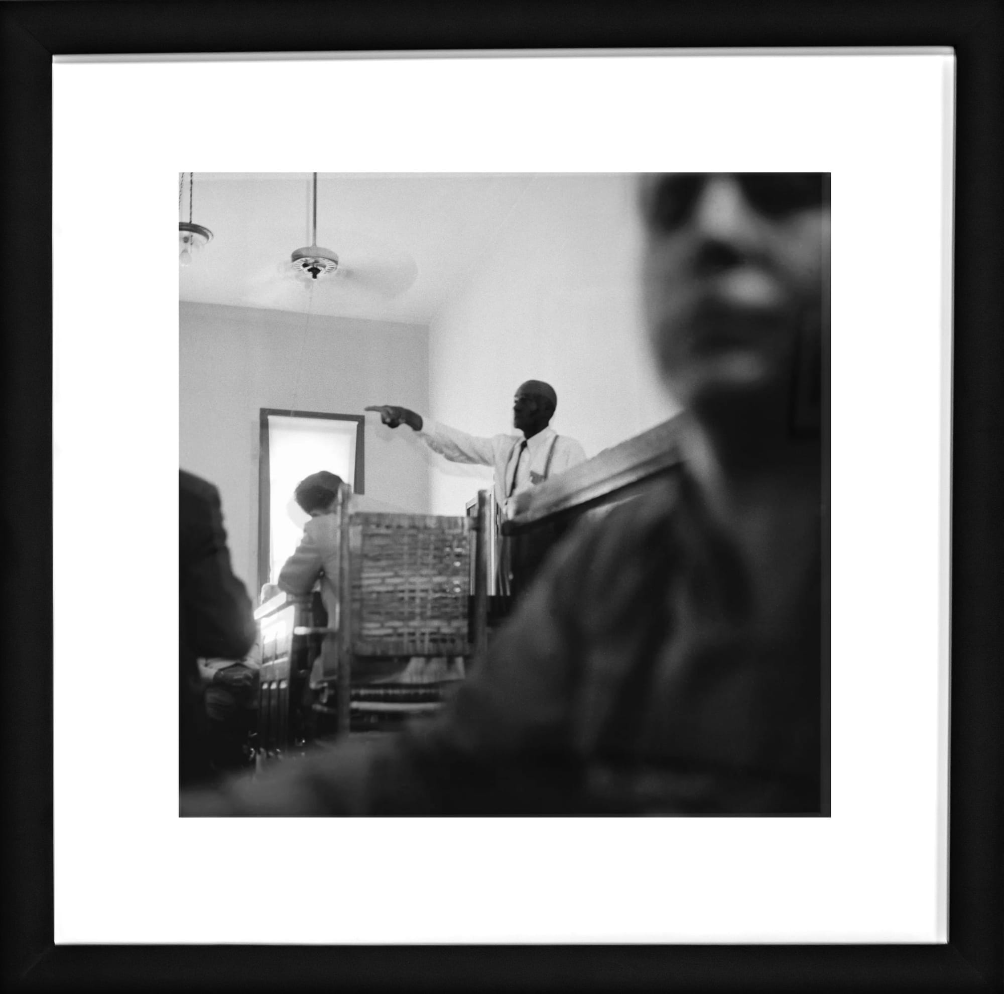 As I looked at Withers's photo of Moses Wright, uncle of Emmett Till, on view as part of Flash Points, the bravery of both the subject and the photographer spoke more to me than this problematic aspect of his life. In the image, Wright, under threat of being lynched, stands up in the courtroom during Emmett Till's trial to point to the White man he saw take his nephew from his house. After the judge warned that photography was not allowed in the courtroom, Withers placed his camera on the ground and captured a shot of Wright. This black-and-white image is the last time Wright was seen before his murder. Without Withers’s willingness to document this moment of courage, we would be missing an essential piece of Black history. Withers gave the photograph to Getty Images to run worldwide on the day of the trial; he only received credit for the image three years ago, according to Rosalind.