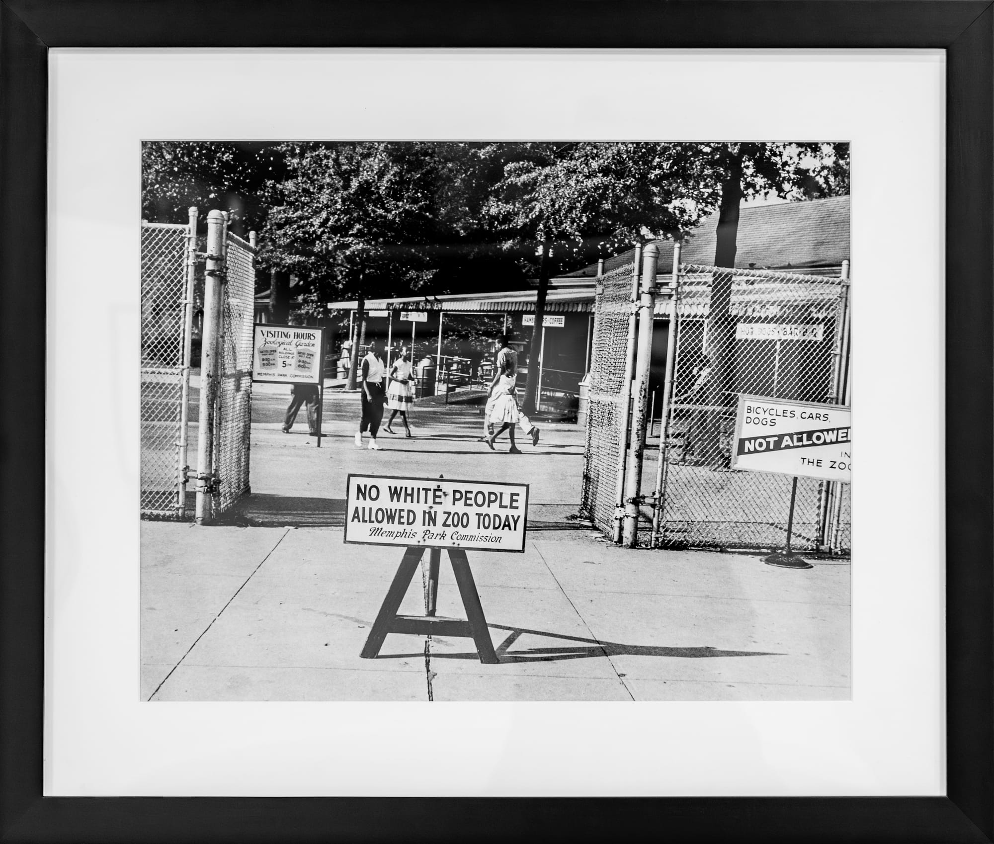 A photograph of the entrance to Overton Park Zoo with a sign that reads "No white people allowed in the zoo today" inspired Rosliand to move from her home in South Florida to Memphis to take over her father's trust. She is now in charge of the more than a million photos her father took after he died in 2007. The picture captures the one day of the year when Black people were permitted in the zoo, which was when the animals got their cages cleaned, resulting in visitors being unable to view many of them. Black children and adults walk behind the sign in the photo's background.