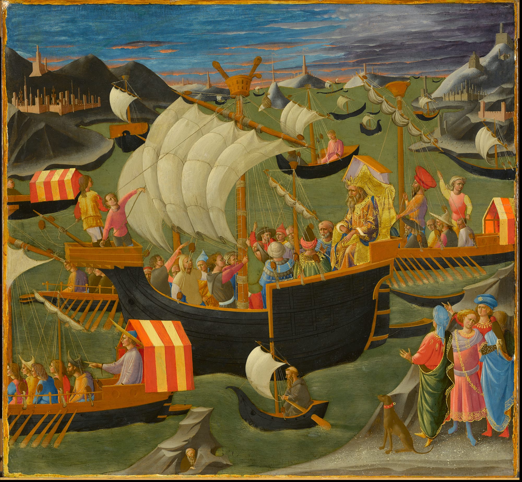 Several of Pesellino’s relatively few accredited works were individual oblong panels that ran in a line beneath an altarpiece. The altarpiece itself would have been the main visual event, as well as the predella panels beneath its smaller accompaniments, which would seldom have been looked at in any detail. Pesellino, who was very good at streamlining complicated stories, often derived from the Bible, to a sequence of easily comprehensible images, was much in demand for such work because he painted so well on this smaller scale.