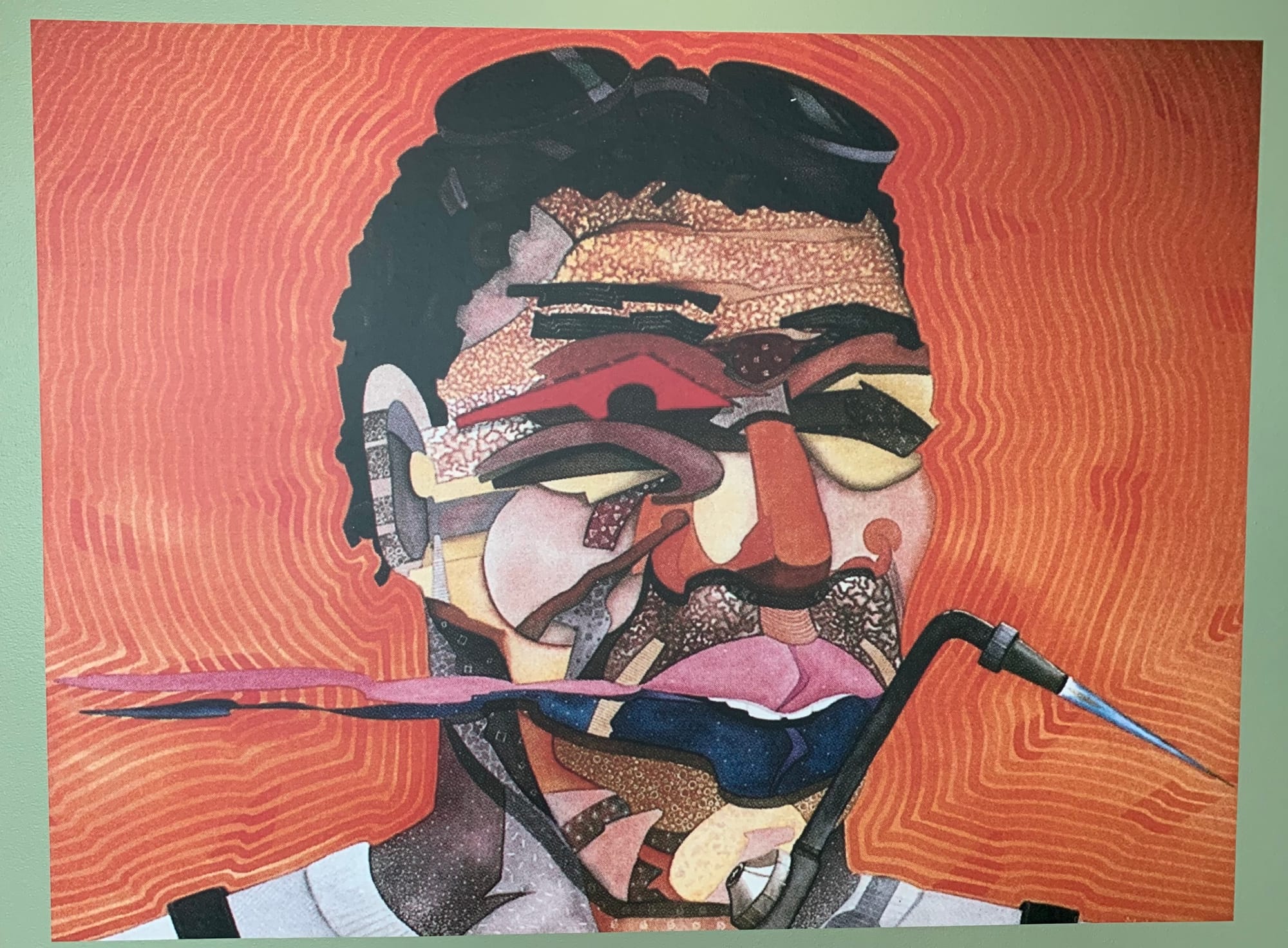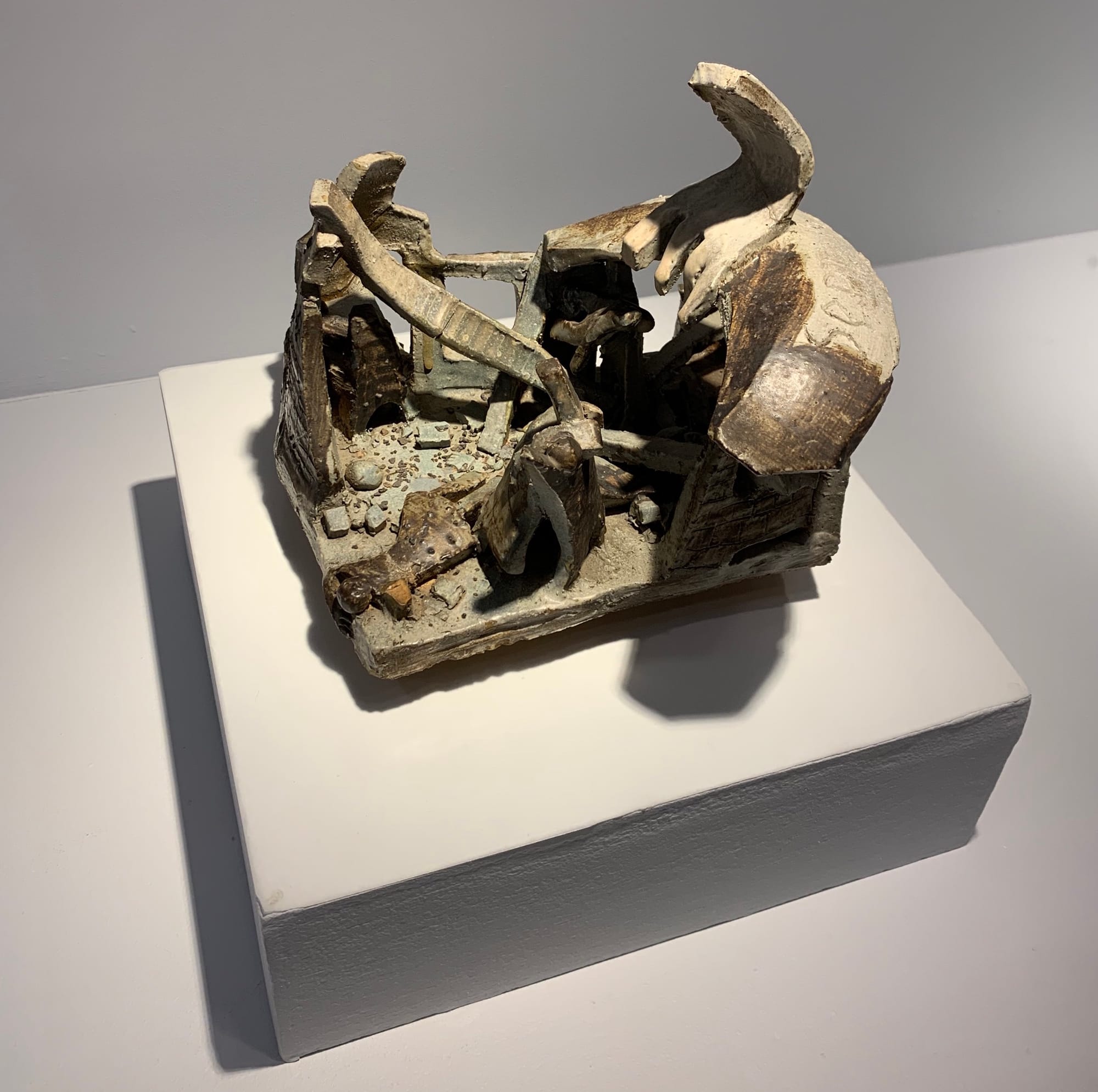 Mark Steven Greenfield was Riddle’s student at Los Angeles High, and would follow in his teacher’s footsteps by becoming an artist. A reproduction of Greenfield’s portrait of John Riddle is displayed at the start of the exhibition, a psychedelic watercolor in which the artist is at work in his studio, goggles over his head, and welding tool in hand. A ceramic work by Greenfield from 1968, when he was about 17 years old, is displayed alongside two works by his former teacher. These works reflect the political turmoil of their time: one ceramic work by Riddle depicts the 16th Street Baptist Church bombing in 1963 while Greenfield’s neon-green ceramic piece resembles a tear gas canister likely used by police against political demonstrators.