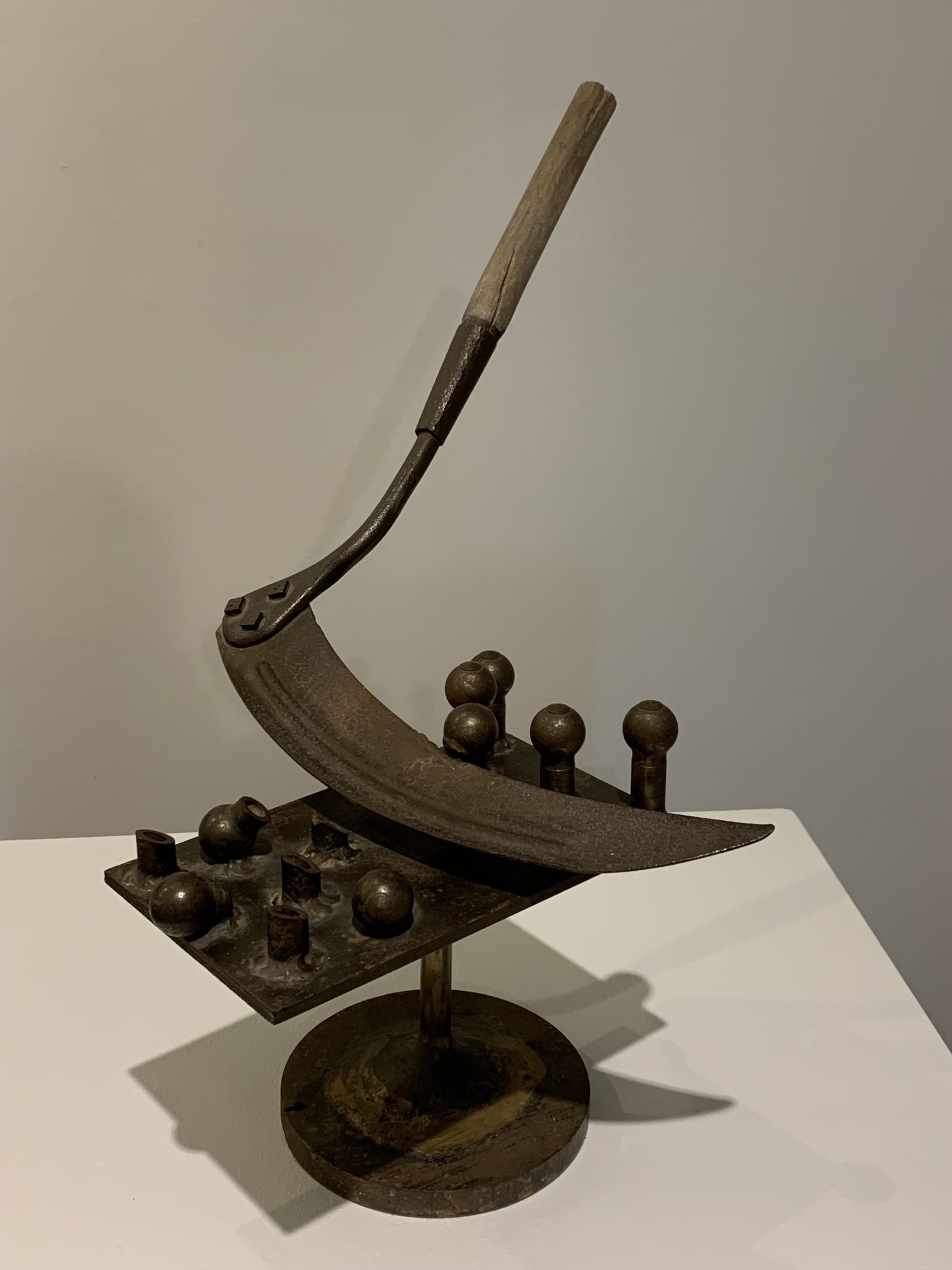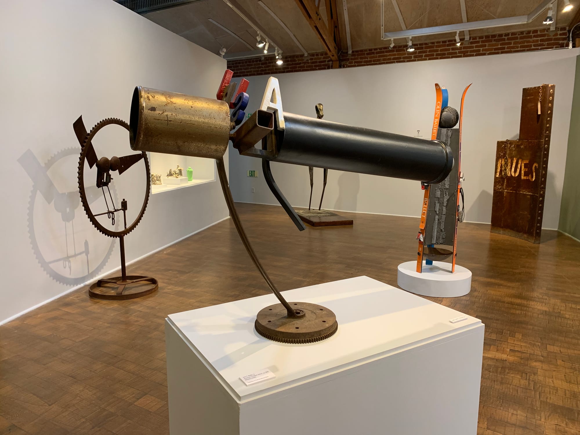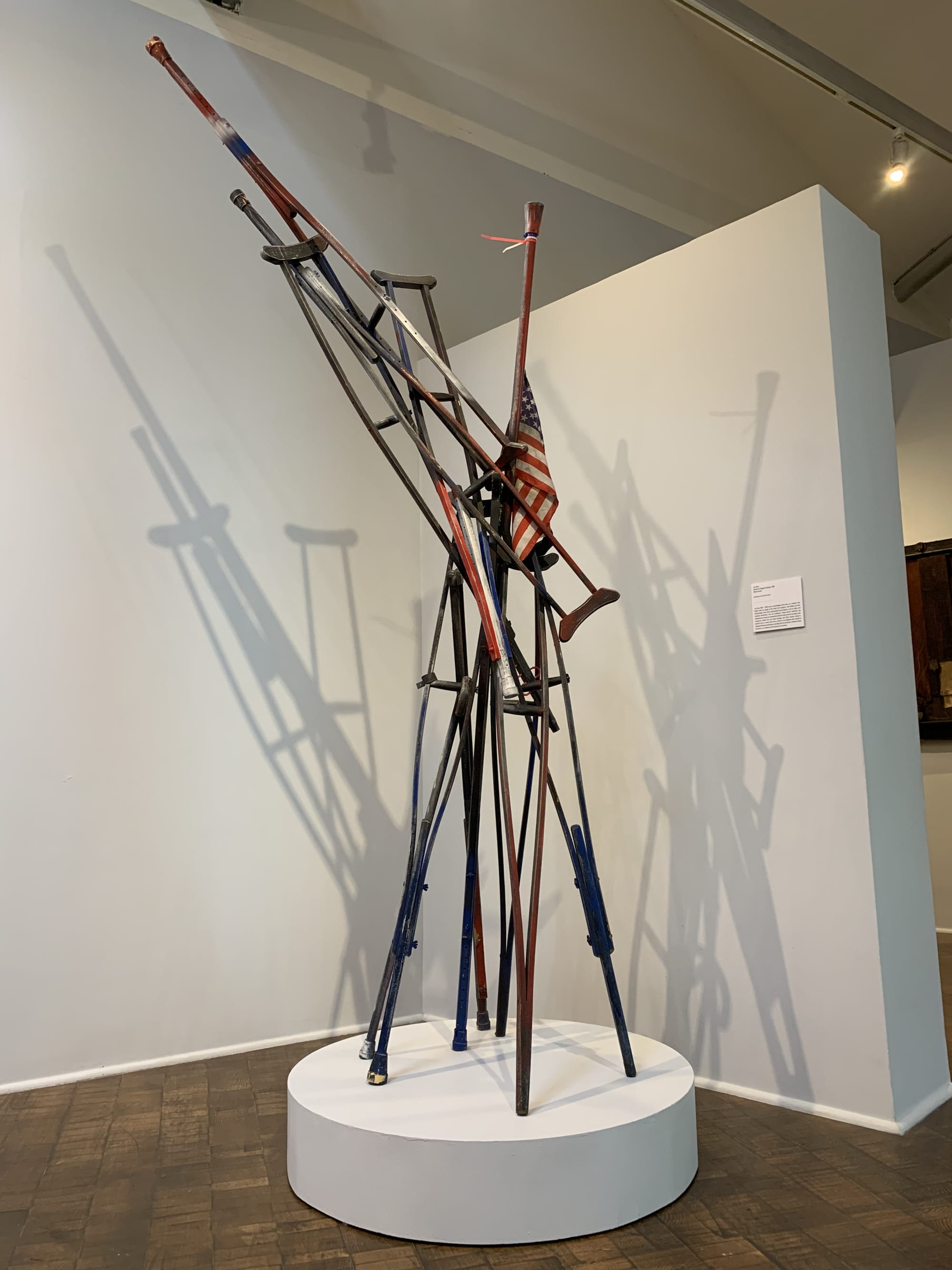 Riddle’s sense of political irony and critique are shared by another former pupil in the exhibit, the artist Joe Sims who passed away this year. The irreverently titled “America’s Problem Solver,” an assemblage piece by Riddle from 1970, combines pieces of metal to form the shape of a rifle scope or gun barrel. Nearby, an artwork by Sims, “American Support System,” precariously balances a set of crutches and an American flag, possibly a reference to the nation’s broken healthcare system or its military that produces generations of psychologically and physically wounded soldiers.