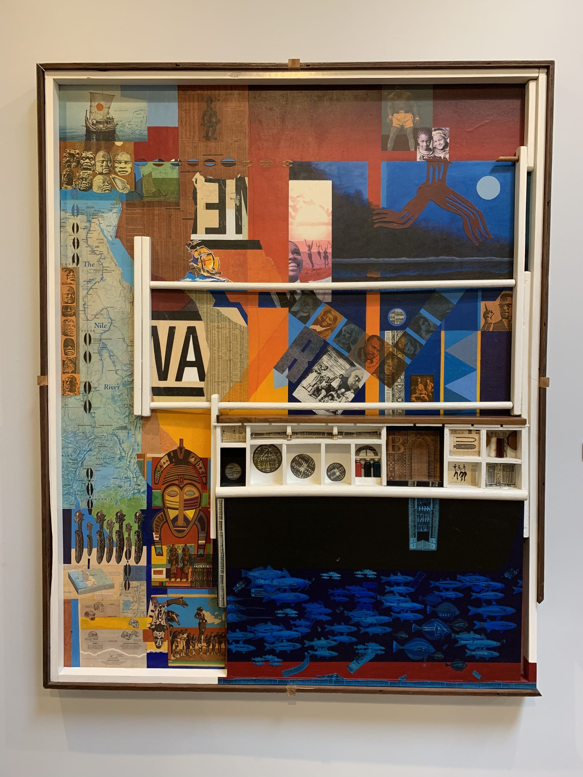 There are other artworks by teachers and artists who ran in the same circles as Riddle. Artists like Timothy Washington and John Outterbridge shared Riddle’s love of using found objects, albeit to different effect and purpose. Outterbridge’s hulking iron and wood piece “Vertical” resembles a piece of rusting cargo ship, while Washington’s “Love Thy Neighbor” takes on a more figurative, otherworldly form. The RIDDLE Effect also includes later works from Riddle’s career, including a series of mixed media collage works depicting not just the dehumanizing treatment of African people as commodities during the transatlantic slave trade, but also the resistance and ingenuity of Africans through centuries of enslavement and forced migration to the Americas.