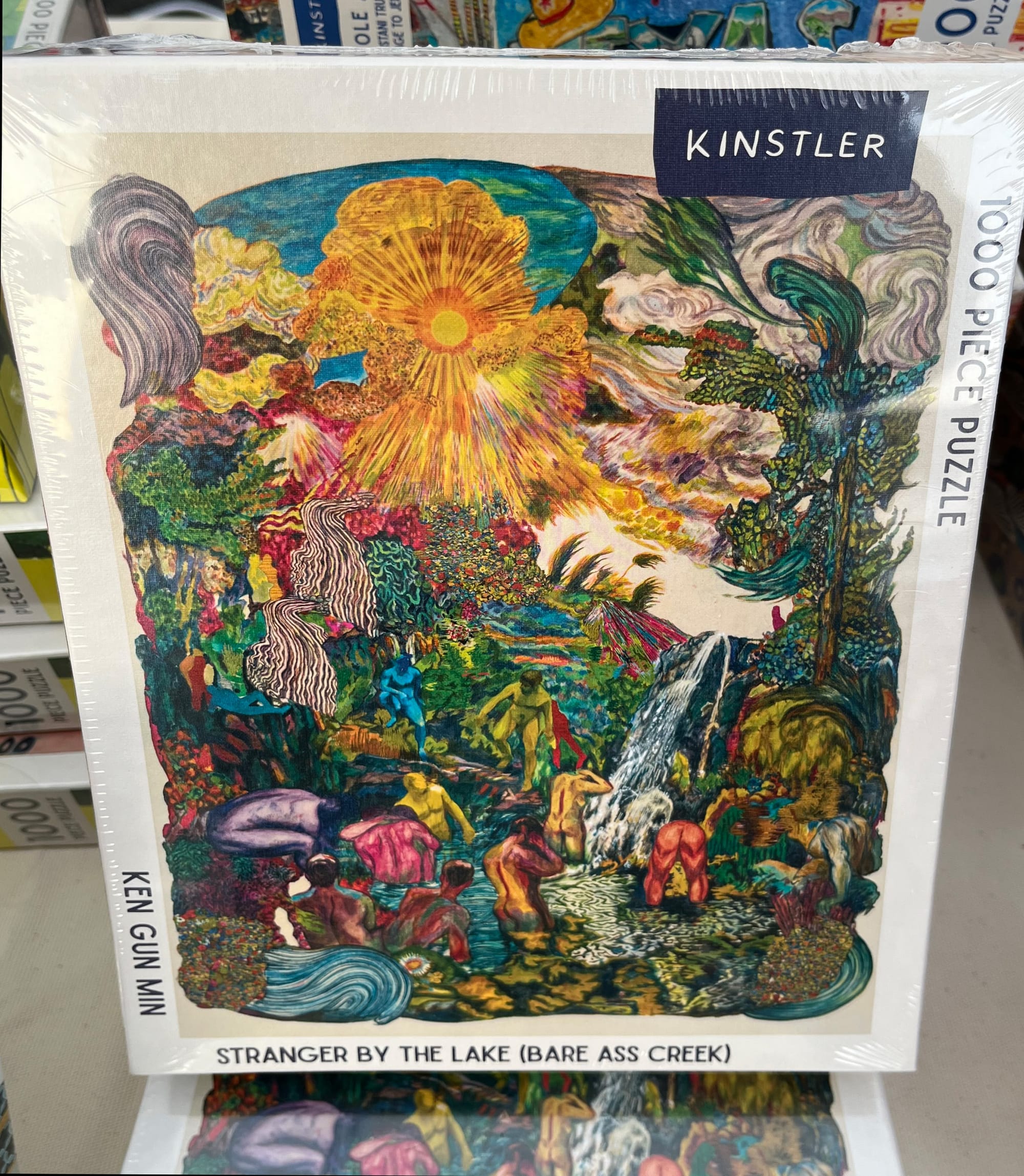 This month, Kinstler is releasing a new puzzle of Korean artist Ken Gun Min’s 2023 painting “Stranger by the Lake (Bare Ass Creek),” an homage to a nude sunbathing spot in Los Angeles that was destroyed in a 2009 fire. Min, too, has loved playing with puzzles since he was a child. He was fascinated by the fact that individual fragments didn’t make visual sense until he fitted them together. Now he sees comparisons between the visual riddles and his current practice.
