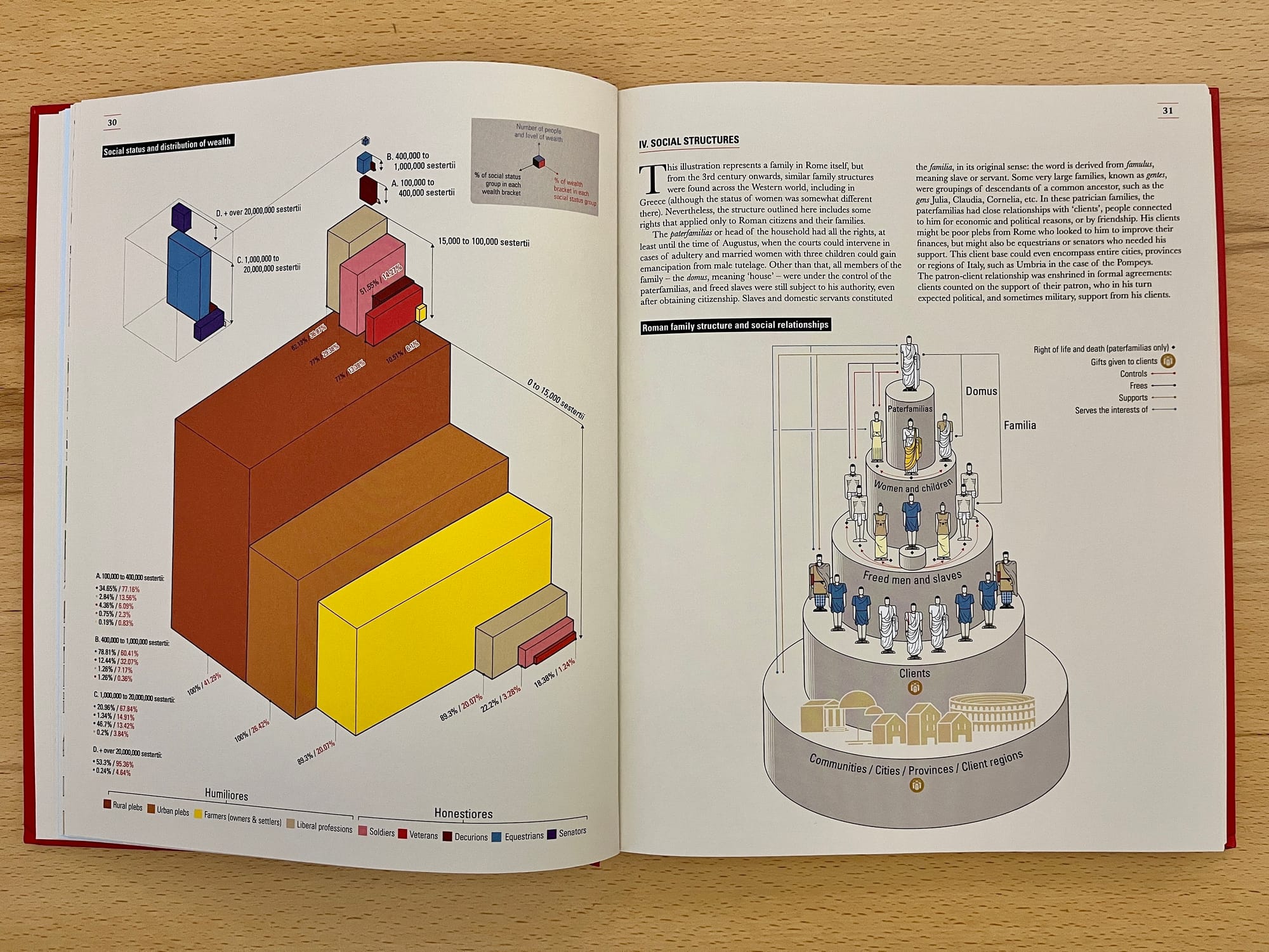 Some of its most insightful visualizations depict the development of these measures across time, helping us see Rome as a growing, evolving entity with many layers of management and operations. For example, in one section on the Roman people, the authors take us through the evolution of Roman Gaul from conquered territory to province, as its population grows from 3.75 million to 7.5 million in the span of some 500 years. We learn about the supply chains of grain, the distribution of budgets, and the rights and roles of men, women, soldiers, and enslaved people.
