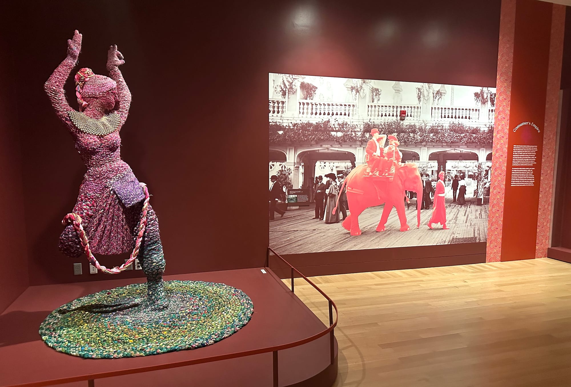 Anoushka Shankar’s sitar, Arooj Aftab’s voice, and Alice Coltrane’s harp spill into the hallway outside the one-room exhibition, on view at the New York Historical through April 26. Suchitra Mattai’s “she arose (from a pool of tears)” (2024), a Bharatnatyam dancer made from used and loved saris, greets visitors at the entrance. The small but mighty show serves as a primer on South Asian history in New York, framed conceptually and visually through the sari in all its infinite pleats, drapes, and patterns.
