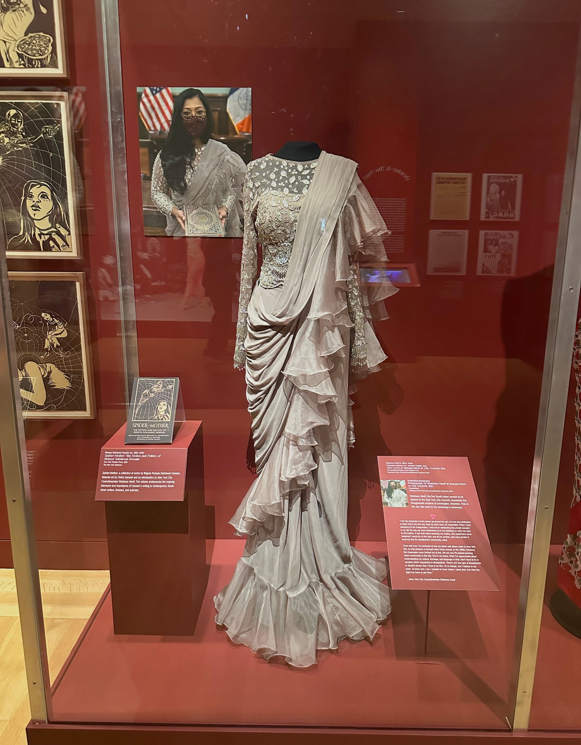 The sari’s traditional form makes relatively few appearances, which seems to be by design. We see the elegant sari worn by Shahana Hanif, the first Muslim and Bangladeshi woman to serve as a New York City councilmember, during her swearing-in ceremony in 2021, and a zerzet sari from Nepali-American organizer Narbada Chhetri. Nearby is an orange-and-red silk sari belonging to Malayali immigrant Dr. Lalitha Krishnan, whose son, Councilmember Shekar Krishnan, originated the idea for the exhibition over two years ago in dialogue with museum staff and journalist S. Mitra Kalita. All are framed in the context of the craft itself, practiced primarily by women whose labor goes chronically overlooked at best and exploited at worst.