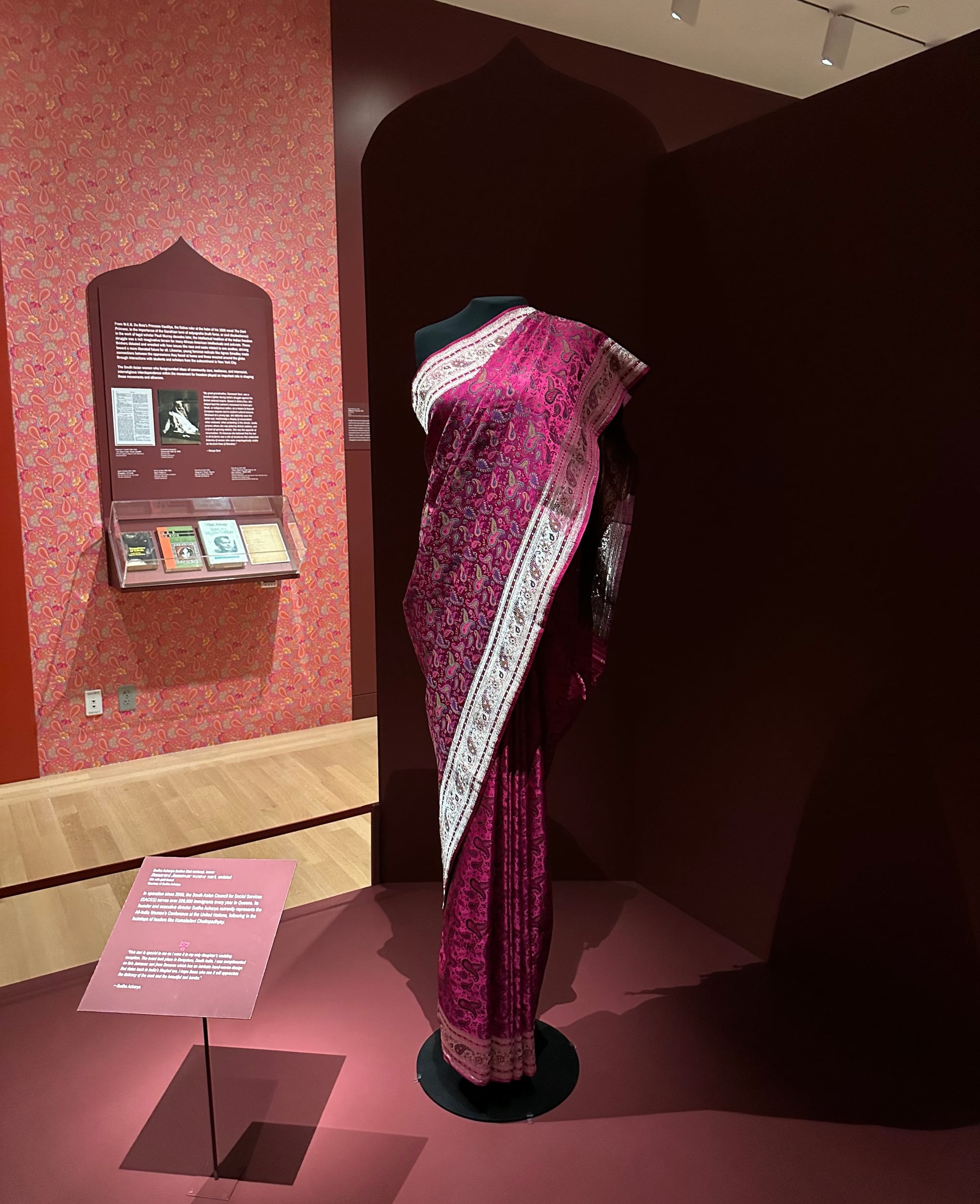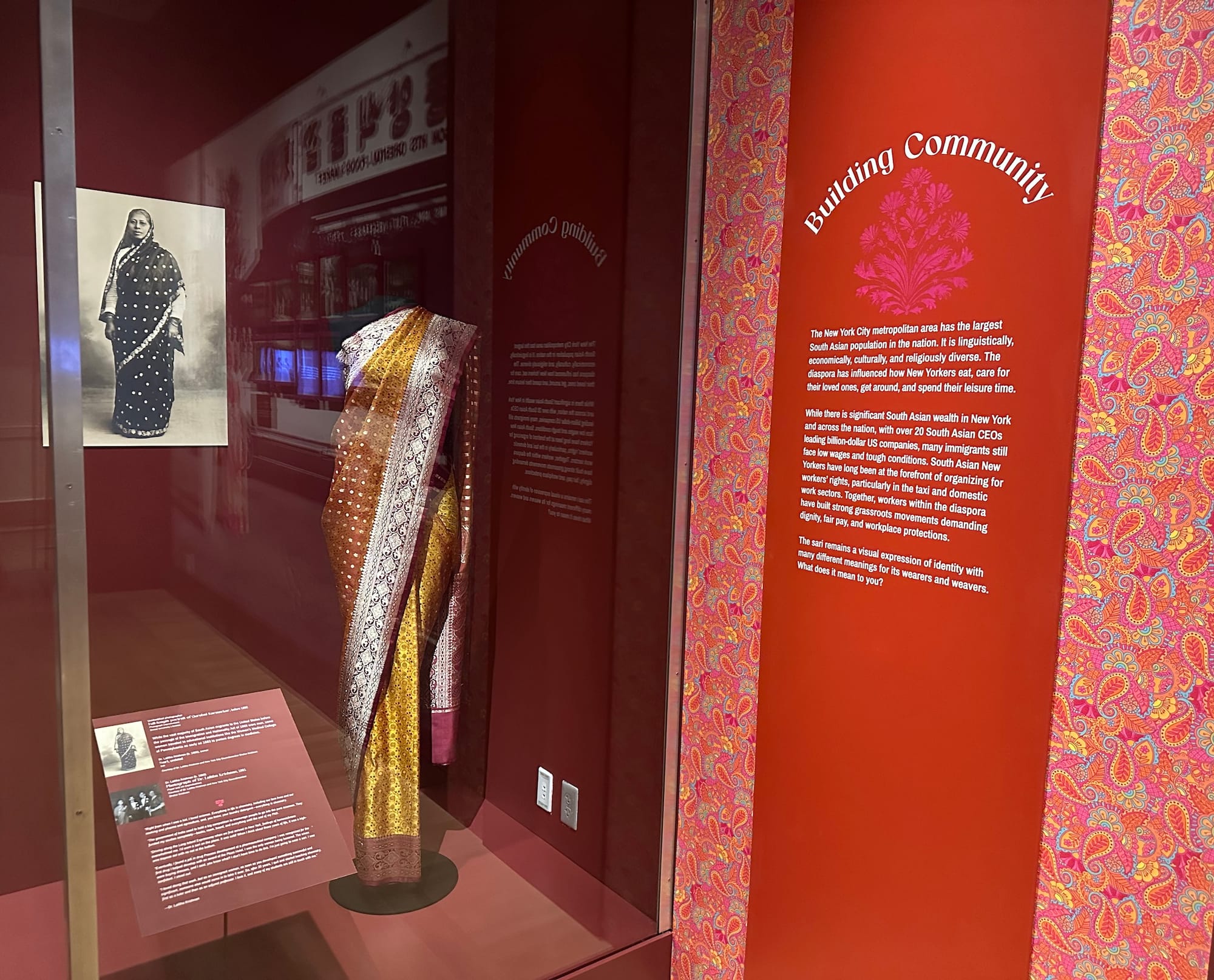 While some of the displays and wall texts include familiar flashpoints in South Asian American history, like the 1965 Immigration and Nationality Act, the curatorial framework of saris as storytellers disrupts the many forms of oppression that fester in the diaspora — casteism, patriarchy, Islamophobia, homophobia — by pulling on a single common thread.