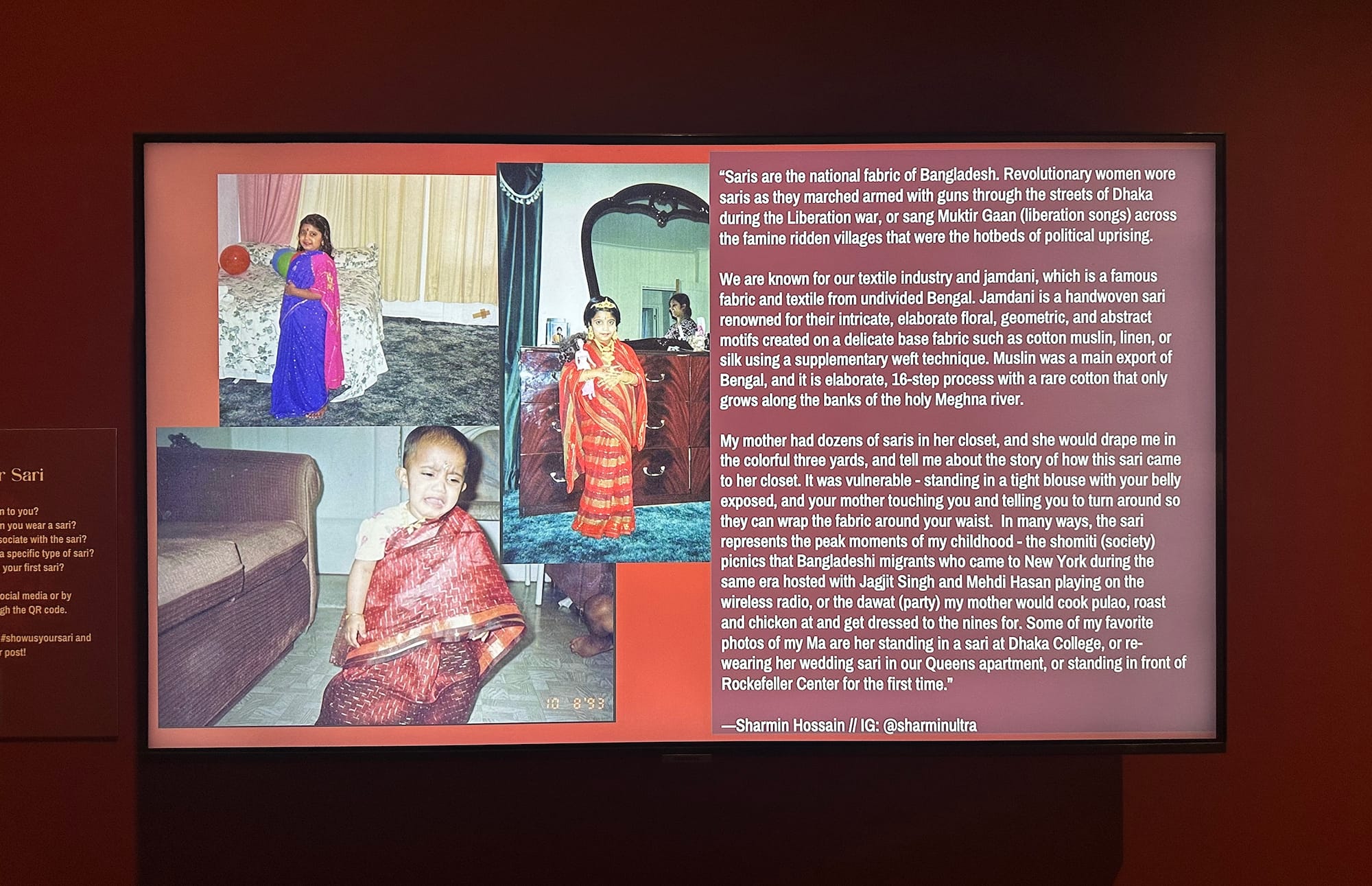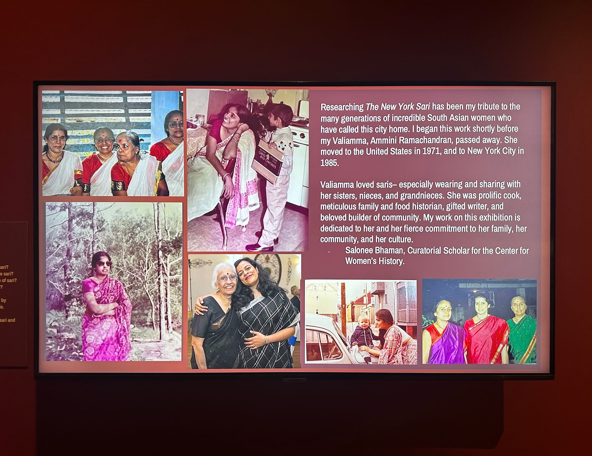 “We knew that there was no way we could capture the full breadth, the full multiplicity of what a sari means in the city,” Danzinger Halperin told Hyperallergic in an interview. “It was really important to us to have a call for participation as part of the exhibition.” That invitation to submit personal stories and photos through a Google Form — some of which appear in a slideshow in the exhibition — reflects the project’s animating force.