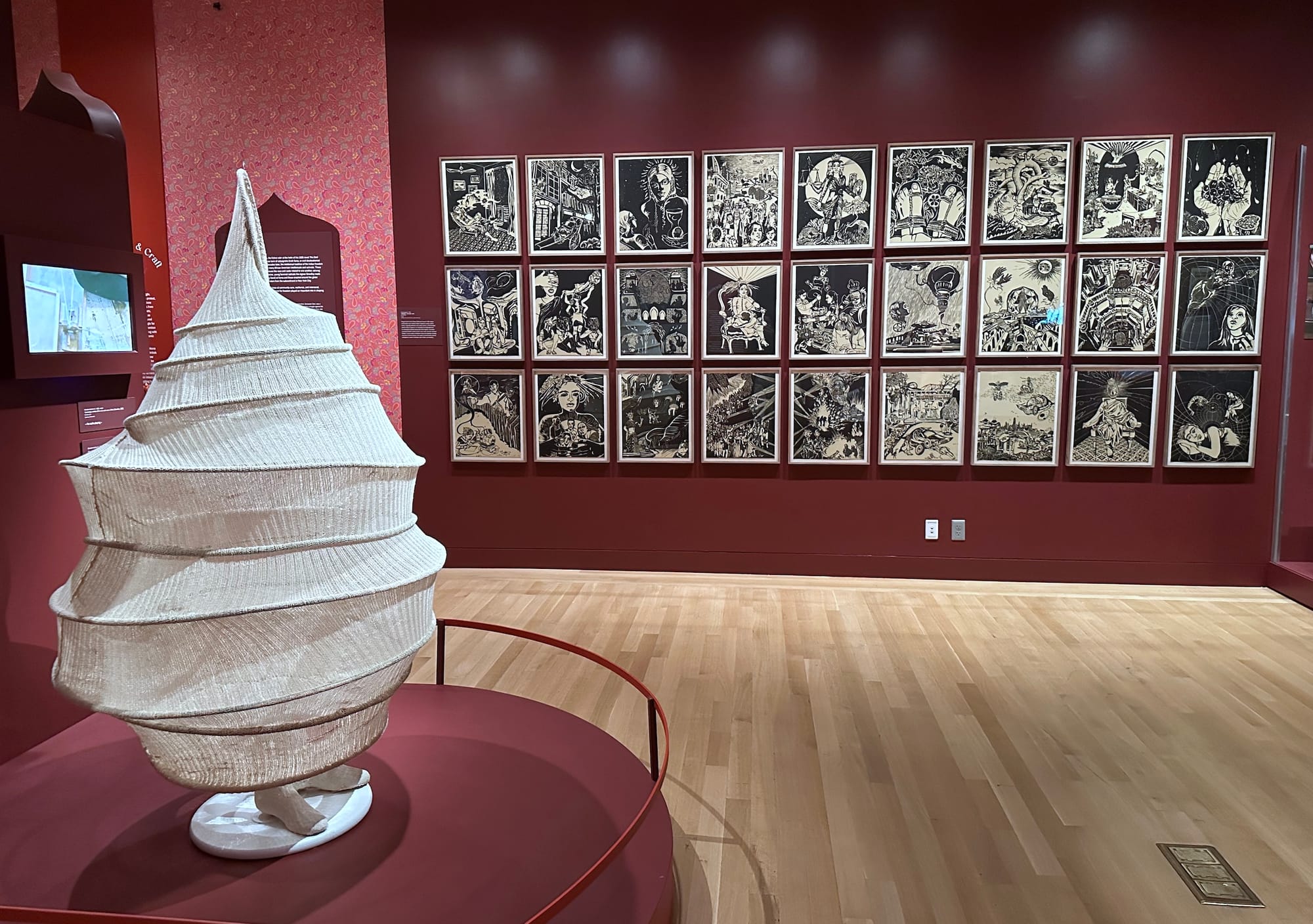 Ganesh, whose 2018 linocut series Sultana’s Dream unfurls a sci-fi epic across one wall, was struck by the way “interweaving archival materials with contemporary art refuses exoticism and nostalgia” across the exhibition.