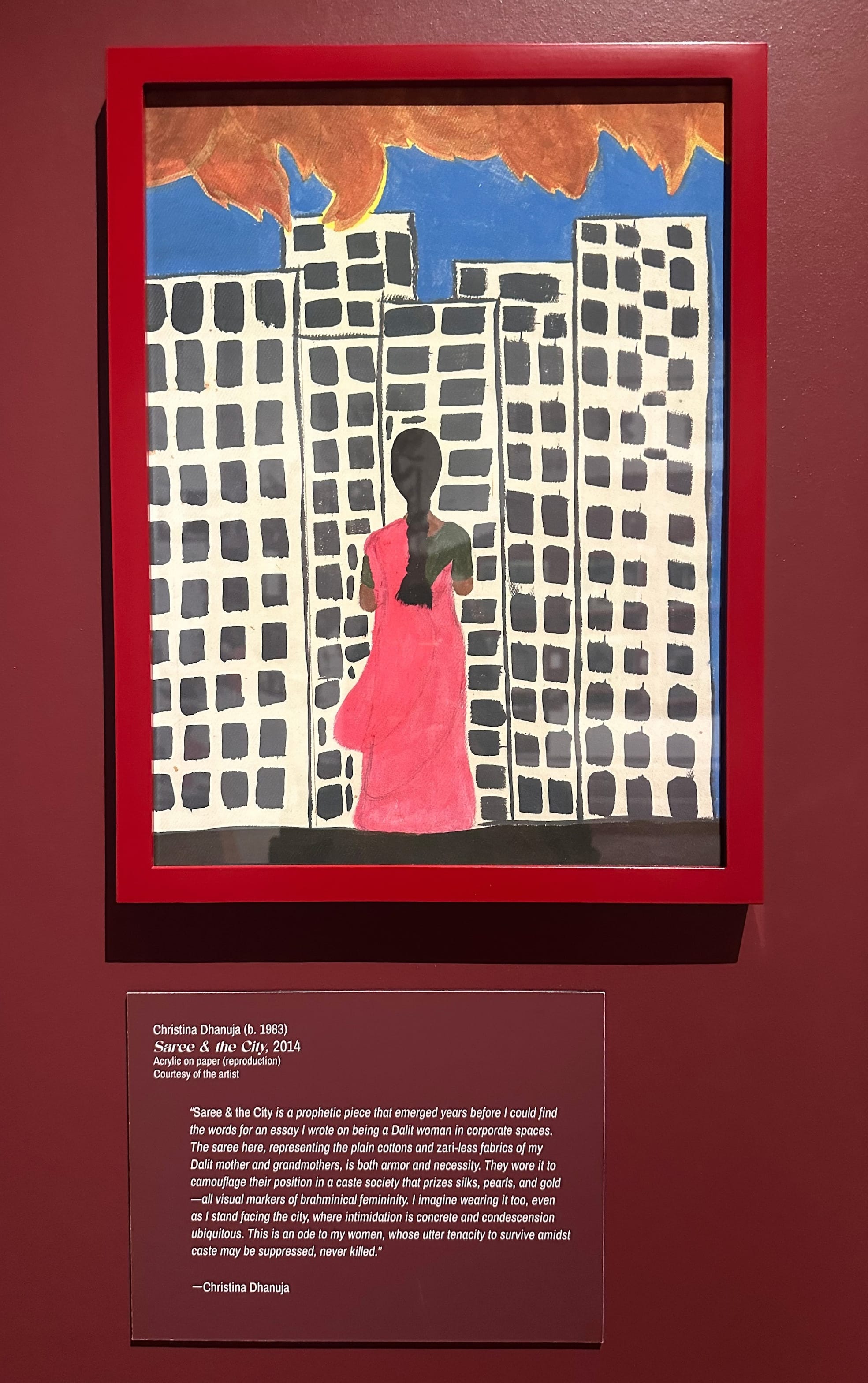 “Perhaps I anticipated the condescension that would come my way, and the plain, pink saree symbolizing my resilience, even as I’d stand facing a city’s intimidation,” she said in an email to Hyperallergic, referencing the discrimination she faced as a Dalit woman in corporate America. Dhanuja has long been outspoken about casteism as “deeply alive” yet routinely erased and denied in South Asia and the diaspora.