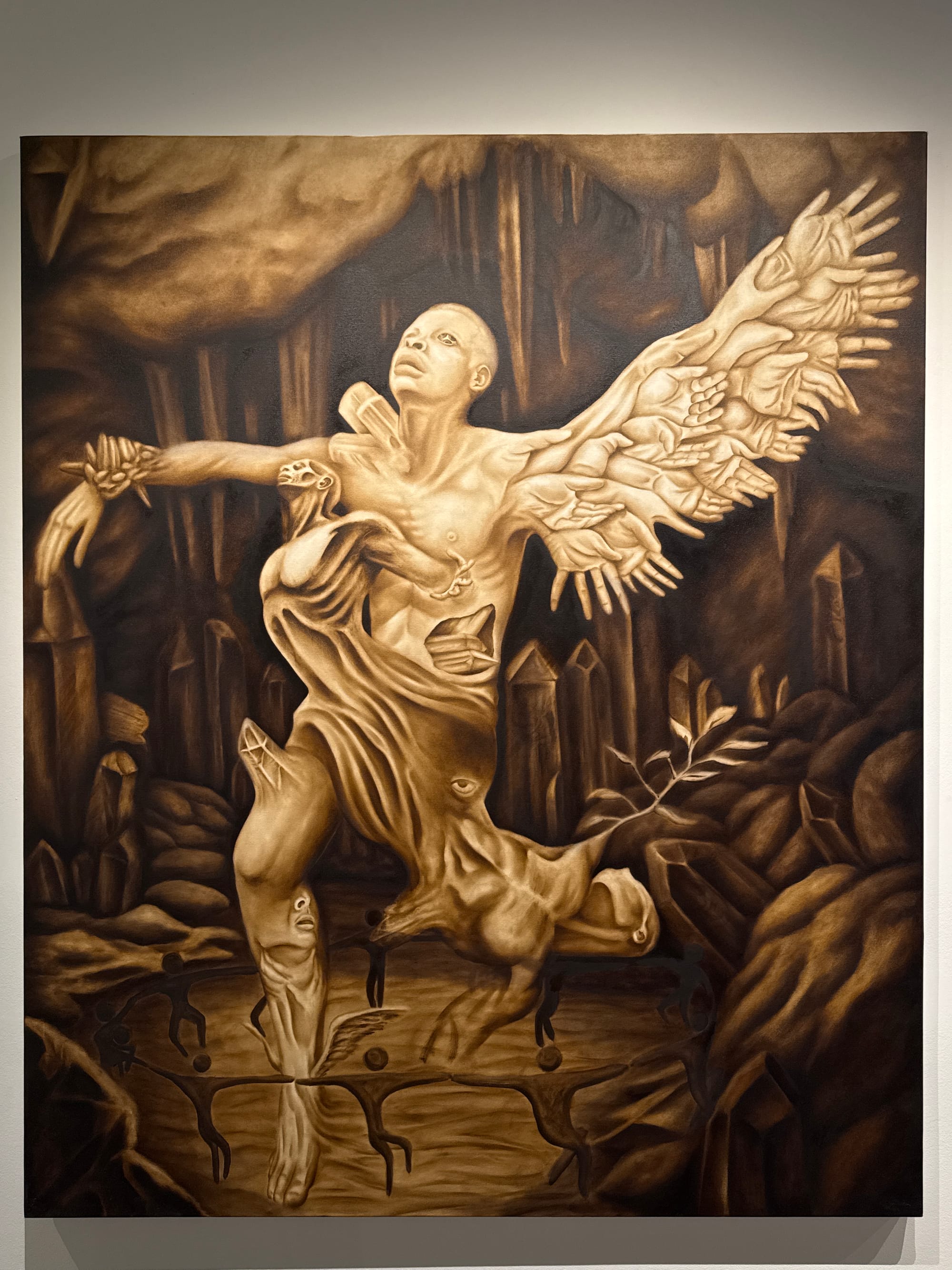 Joshua Evans’s “Fantasia" (2024) sums up how many of us are feeling right now. The figure is mid-metamorphosis — but doesn't appear to have much of a choice or to be enjoying it that much. Despite his lack of fully-formed feet, and the uncertainty and gloom surrounding him, the figure trudges the path ahead. "He is trying to negotiate who he is going to be ... but it's not entirely clear yet," Evans explained to Hyperallergic. "It's happening regardless." As many of us cope with the fallout of Trump's second term, and its many unwelcome changes, "Fantasia" feels like a portrait of our zeitgeist.