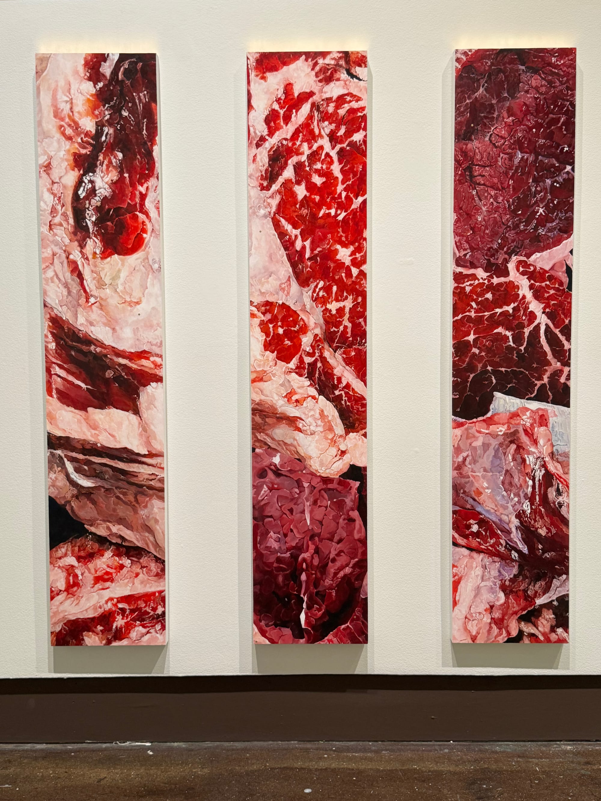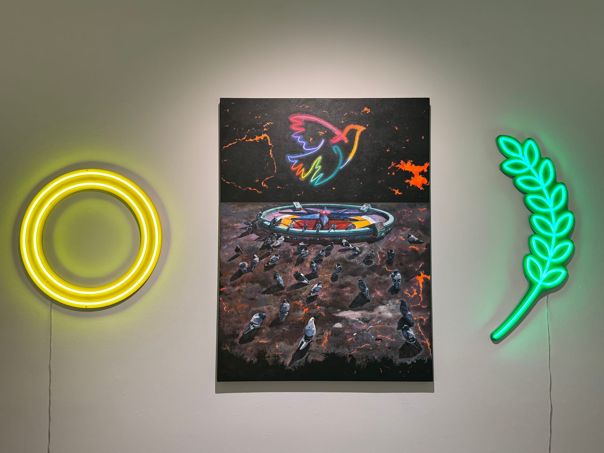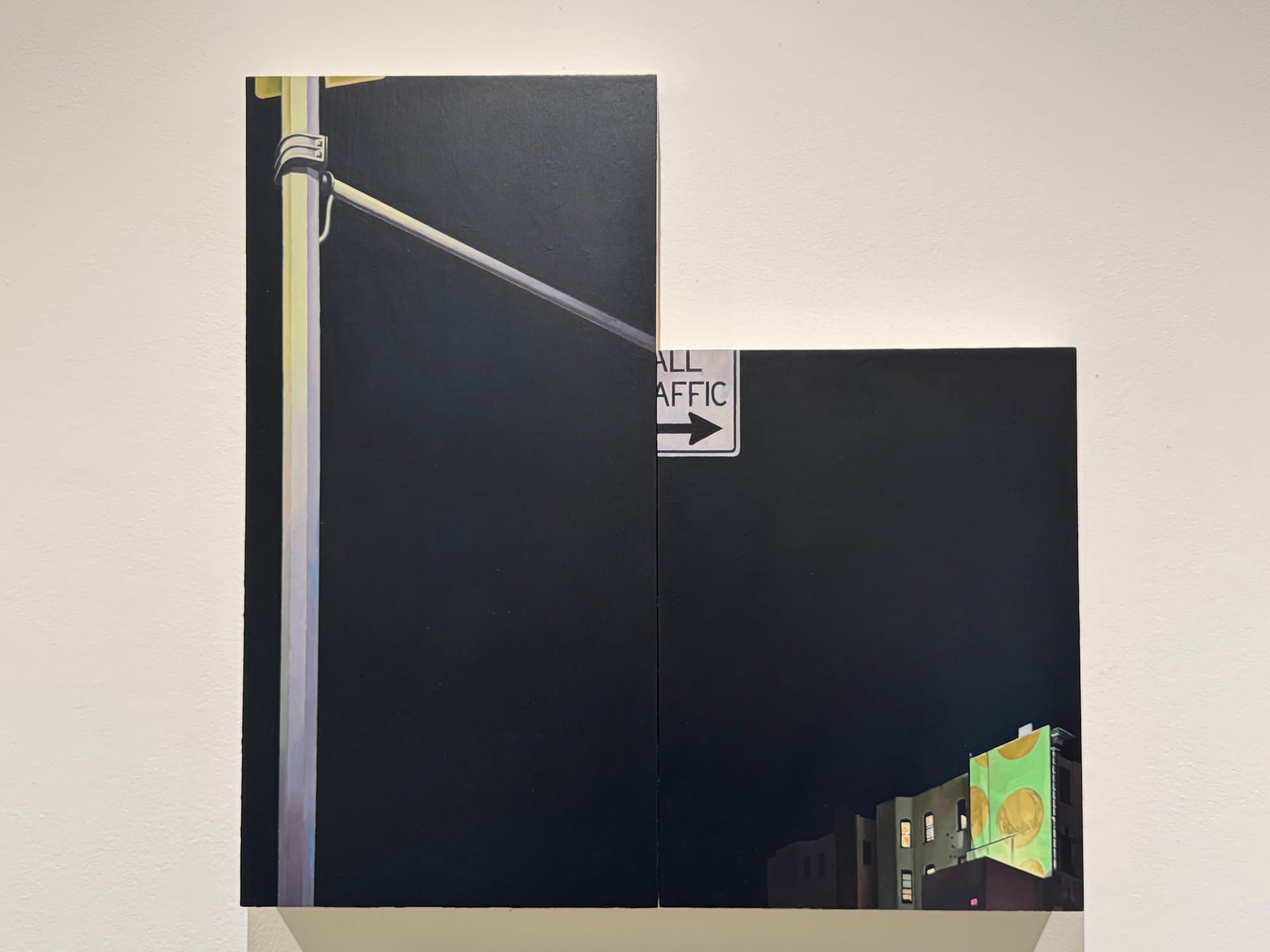 In "Homesick Alien," Ruoxi (Jarvis) Hua offers two uneven painted panels of New York's East Village at night. The longer a viewer looks at the works, the more incongruous they become. On the left, the traffic signal post and its mast arm do not line up with the traffic sign on the right, which is also partially cropped. The longer one dwells on the work, the more misdirected one feels. As Hua explained, "I made the sign that way to stir things up ... I wanted to give more ambiguity to the painting."