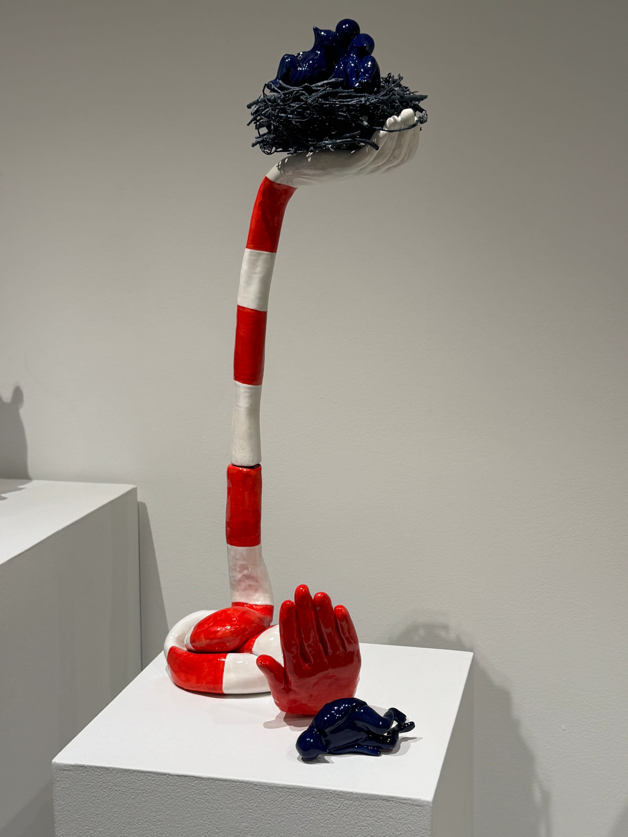 Nathalie Marti's sculpture "Starless" (2025) addresses the rising hostility towards marginalized people in the United States by incorporating the red, white, and blue of the American flag without any stars, alluding to the diminishing luster of the nation's democratic ideals. In the sculpture, a young bird has fallen from the nest, while a red hand forbids it from returning. Meanwhile, a white hand is lifting the other birds in the nest high above. "It's about the people who are left out," Marti explained. She deftly portrays the invisible hand of the market, which inflicts so much harm to vulnerable people, as a faceless perpetrator.