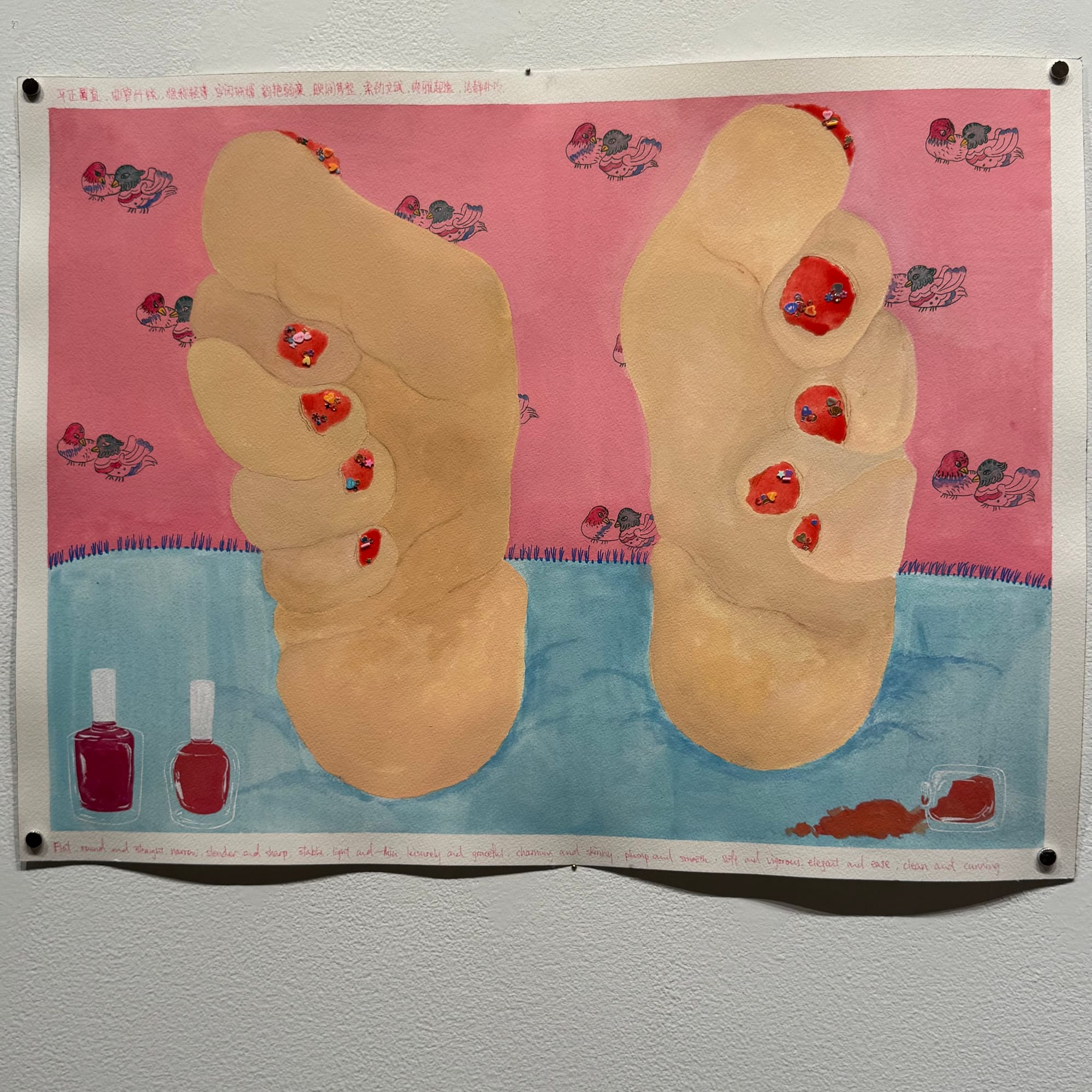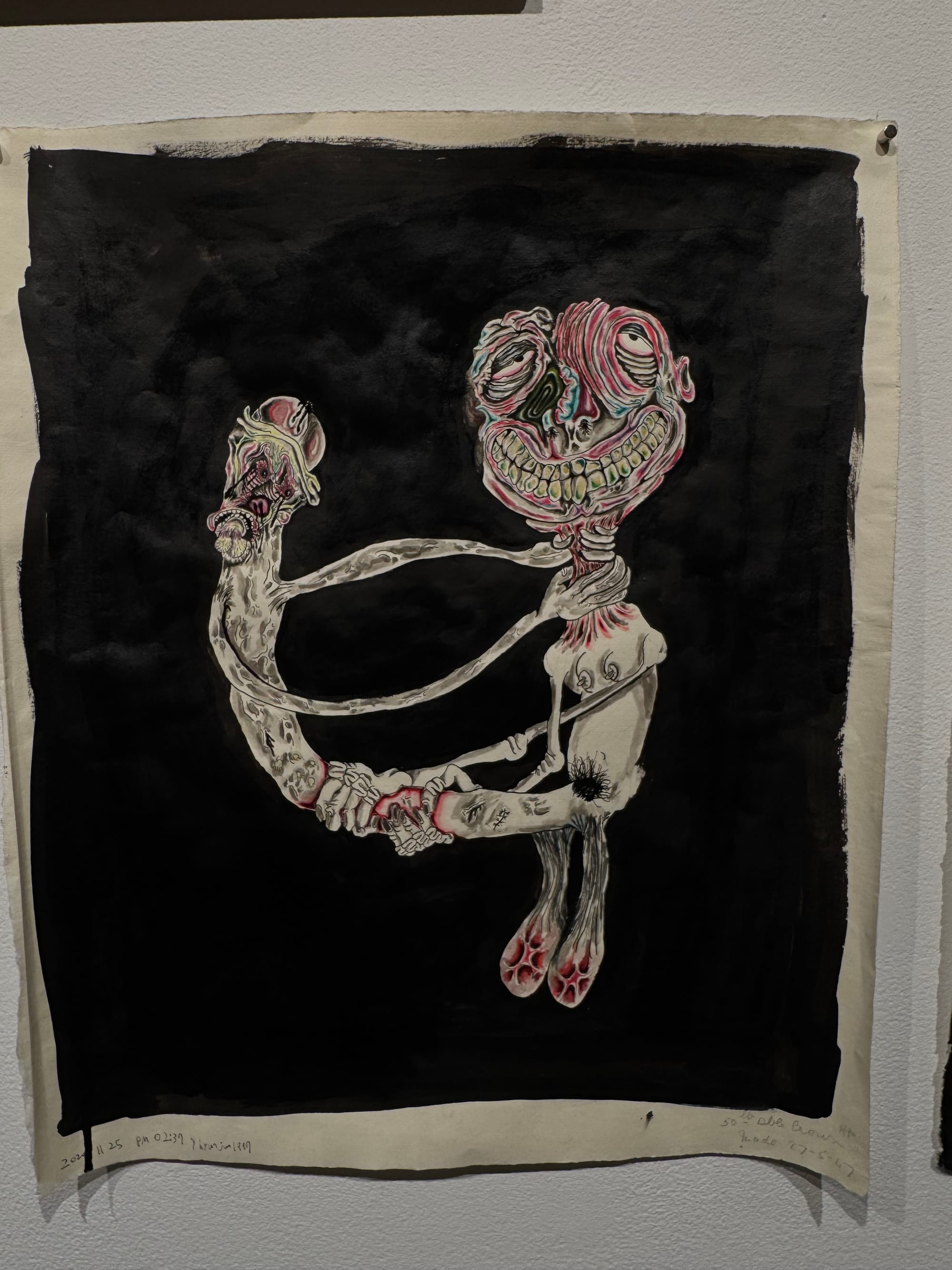 Hyunjun Yang takes on another system of power and marginalization in his drawing “Stroke the Cock” (2024), in which a man is choked by his own penis. Yang approaches toxic masculinity from a more unorthodox corporeal angle, examining the unhealthy relationships men can have with their sexualities, families, and wider communities by satirizing the relationship that many men have with their own penises. In the drawing, Yang explained, “the penis has had enough because the man is addicted to masturbating," critiquing the lack of self-control and respect for others that many mistake for freedom.