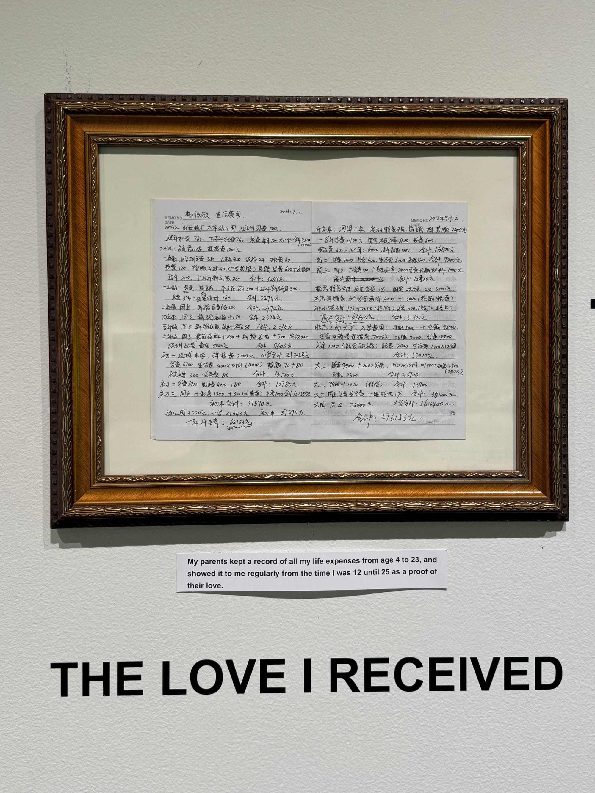 Isa Yixin Yang takes up this family definition of love in her searing work “The Equation of Love I” (2025), inviting each of us to think about the love we received in childhood and the paths it laid out for us. Yang's parents methodically tracked every expense they incurred on child-rearing from ages four through 23. On the walls of the gallery, she frames the ledger of these expenses. Next to it, she hangs documentation for a house she purchased for her parents, and then a debt clearance certificate certifying that Yang no longer owes her parents, which they signed. As Yang explained in her artist statement, "in creating this work together, we built a new kind of love — one that no longer feels like a debt, but a clean slate."