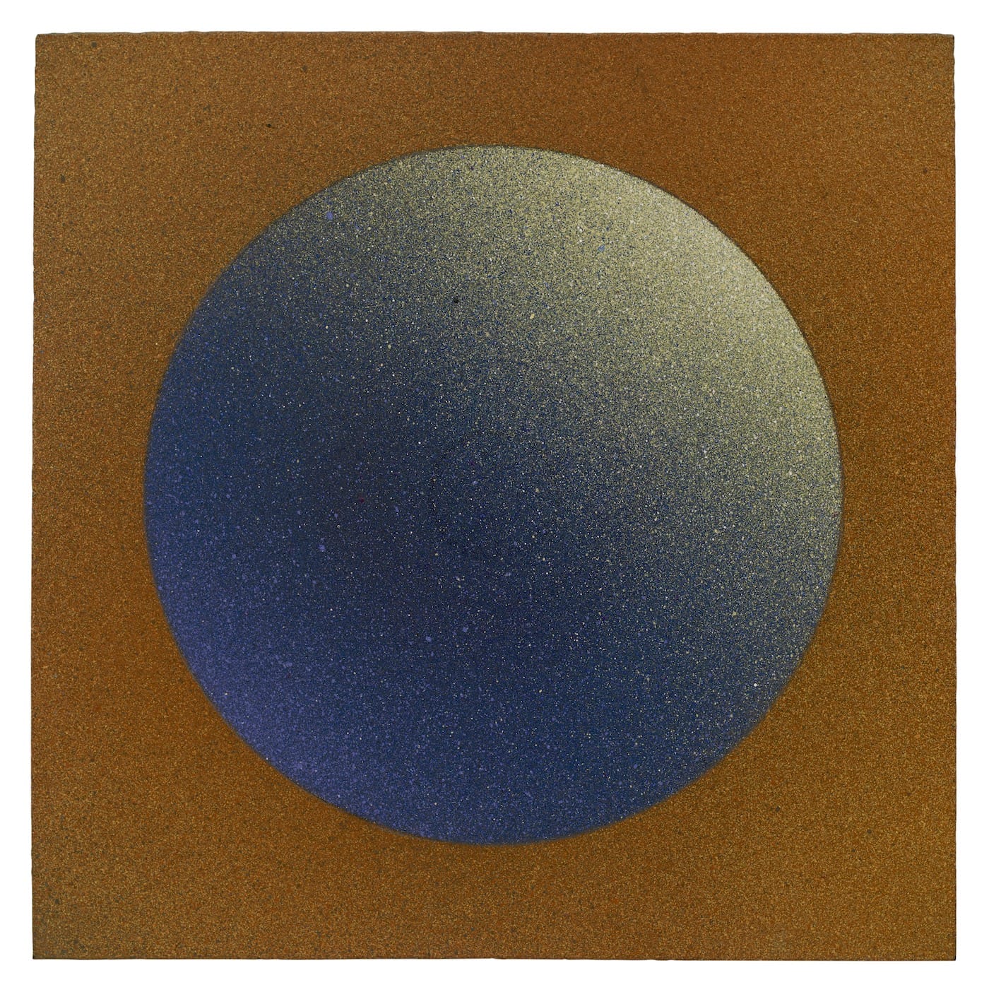 In the later paintings, which are dated between 1953 and ’65, Belson usually works on a square surface with a centrally located circle or sphere, or with an inflected field of dryly painted monochromatic color.