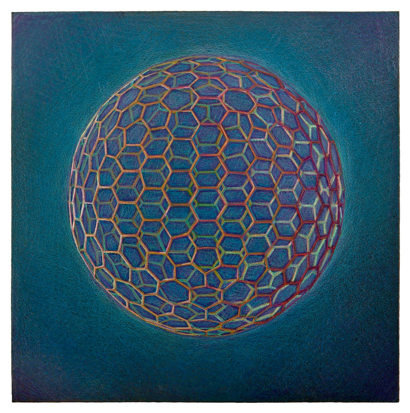 In addition to casein, Belson used tempera and dry pigment in oil. In addition to concentric circles, he found inspiration in geometry and pictures of nebulae – cosmic dust and gases – as well as spherical structures, which he used in images such as “Porazzo Polyhedra” (c. 1965), an open sphere made of octagons and pentagons tightly fitted together. A feeling of wonderment, mystery, and meditation flows through the work. Belson’s art possesses an inner glow – dust becoming light.