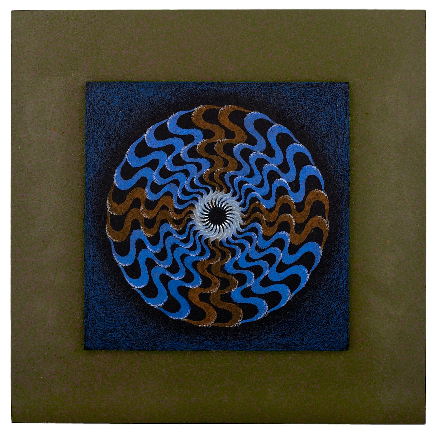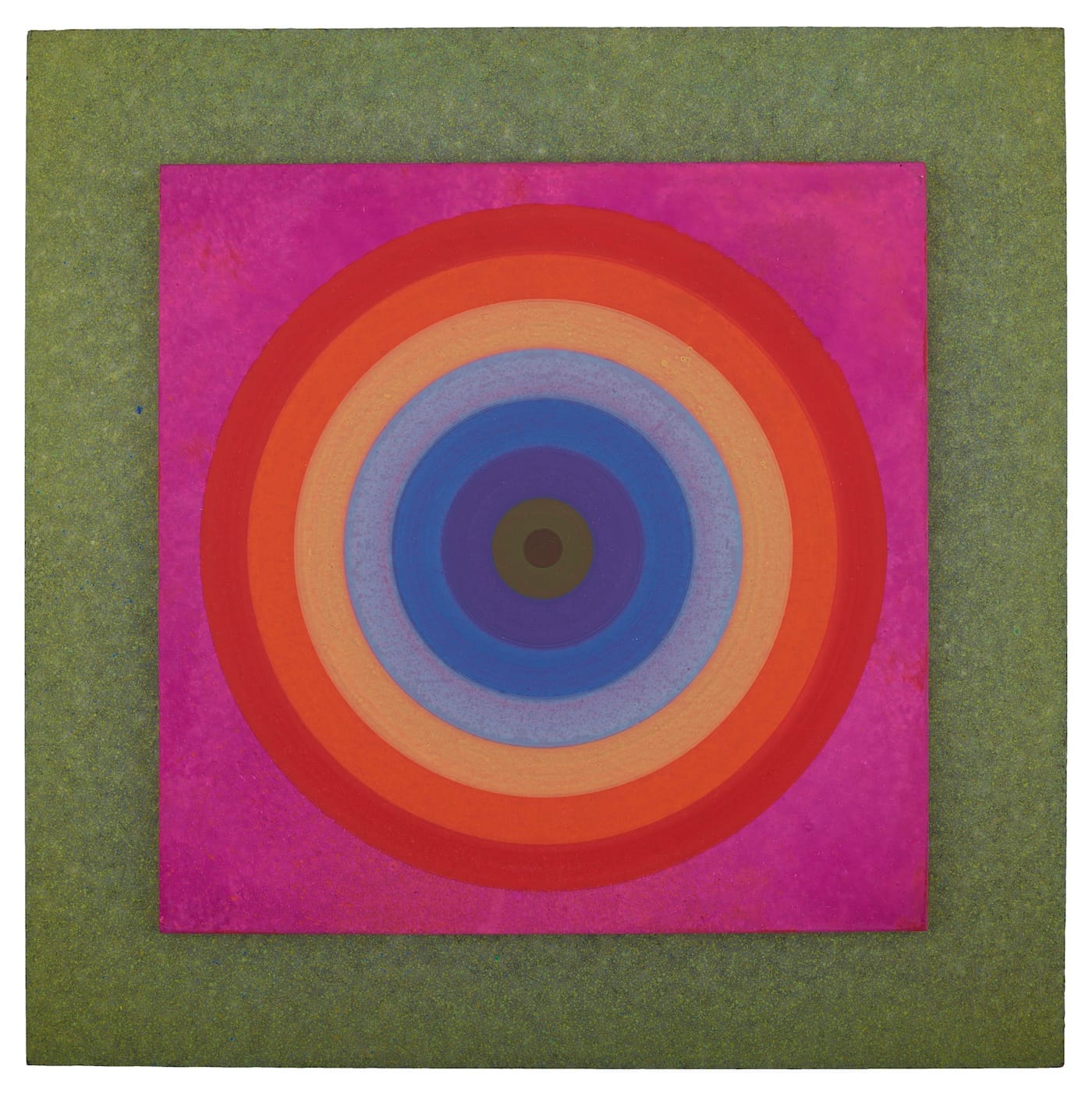 In “Target” (c.1953), which is painted in casein on a panel measuring 15 by 15 inches, Belson comfortably fits the target’s concentric circles against a mauve ground. The outermost circle is a deep red, with the next rung a glowing orange, and the next one painted a dull yellow. The following three interior circles are in different hues of blue and violet, that the cool innermost circles are contained by hot and warm ones. A dark red circle, set down like an unapproachable gem, defines the center. The medium is casein, which becomes a non-reflective, chalk-like surface. The panel is mounted on a round, dryly painted green panel set within a thick black frame.