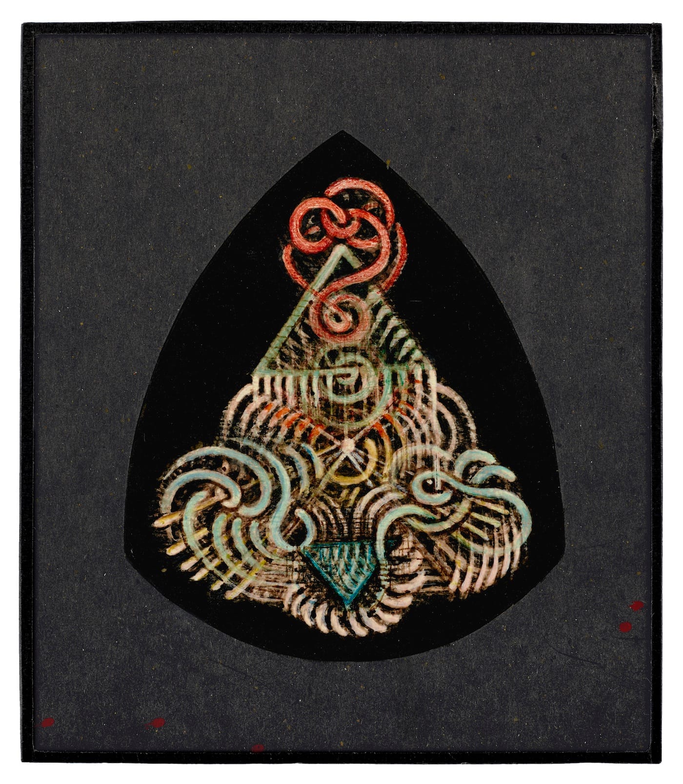 Defined by linear geometric structures, intertwining, snake-like lines, ribbed forms, symmetry, and asymmetry, the entire form of “Untitled” (c. 1950) becomes a unified icon to muse over, while considering the interactions of the contrasting structures within it.