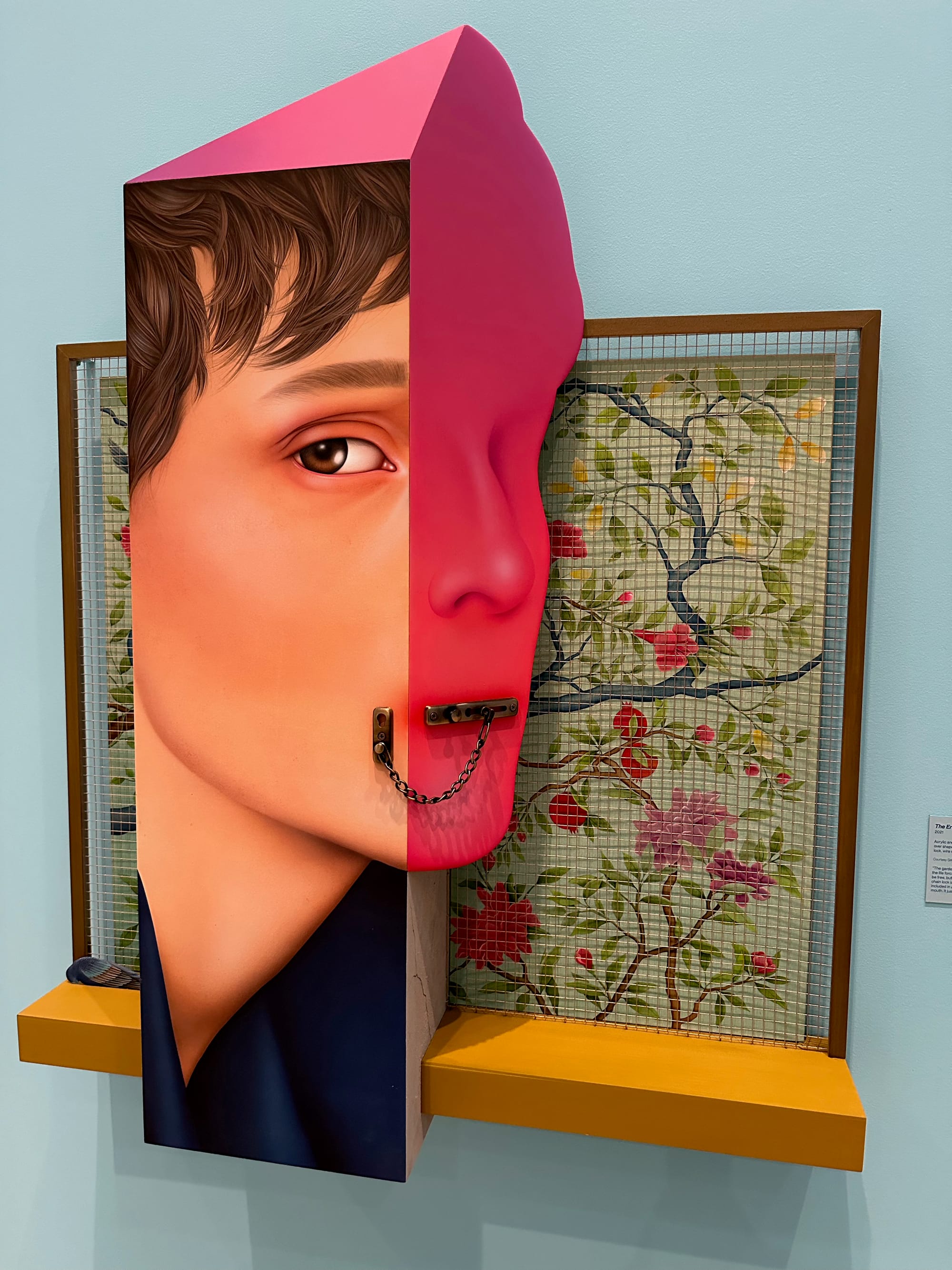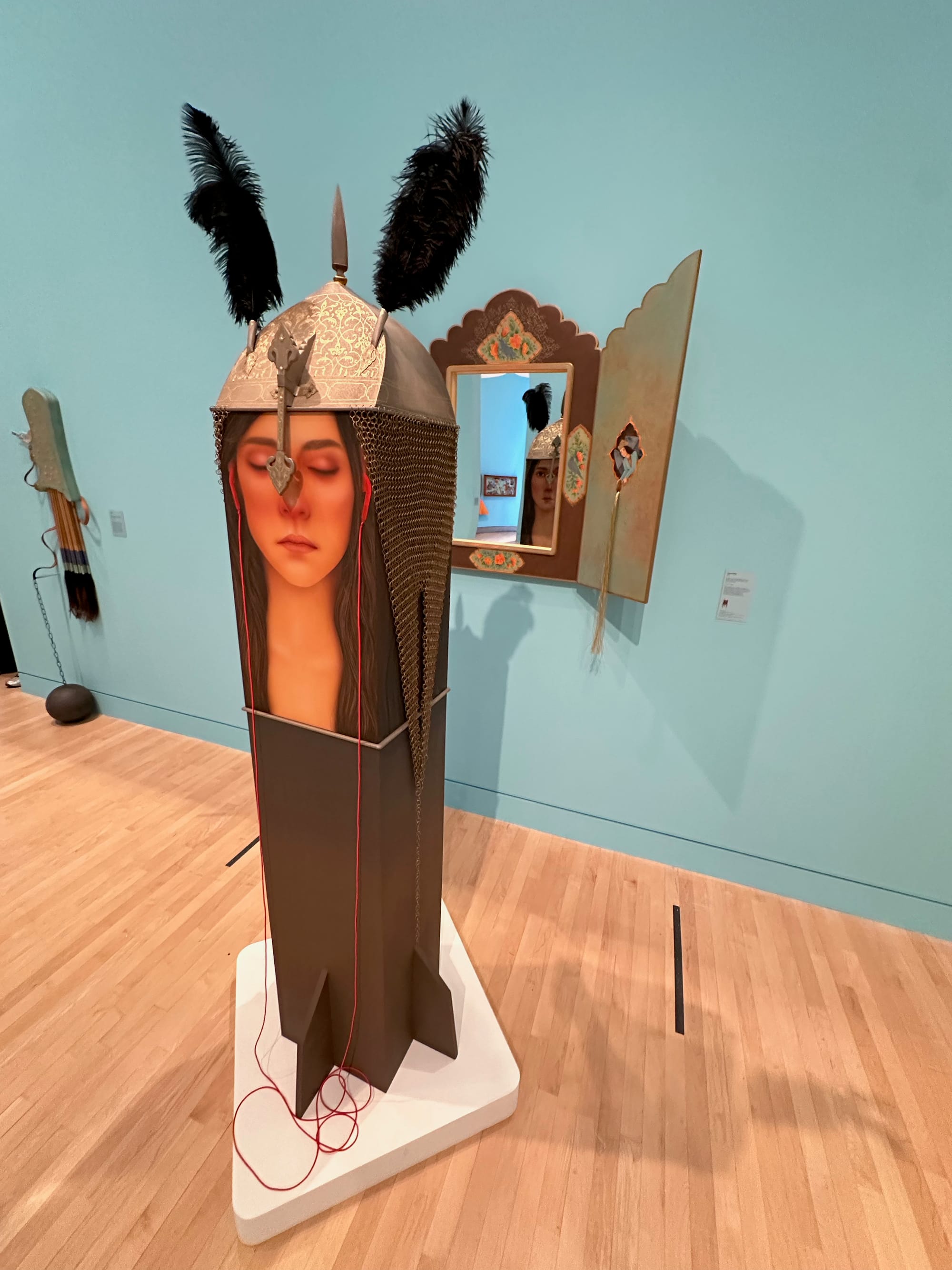 “The Enclosed Garden” (2021) perfectly encapsulates the strength of her aesthetic. The figure, if we can call it that because it is only a fragment of one, is seemingly silenced by a door chain lock, suggesting home isn’t safe, while a metal screen obscures the beautiful floral pattern behind. In “True to Self” (2023), she directly references a Safavid-era helmet in a Scottish museum, and places her image (or what she calls 'alter egos') in relation to it, bringing together two things that historically may not have been found together. Then she places it all on a missile-like form staring at a mirror that reveals her eyes in the reflection. It’s a visceral moment.