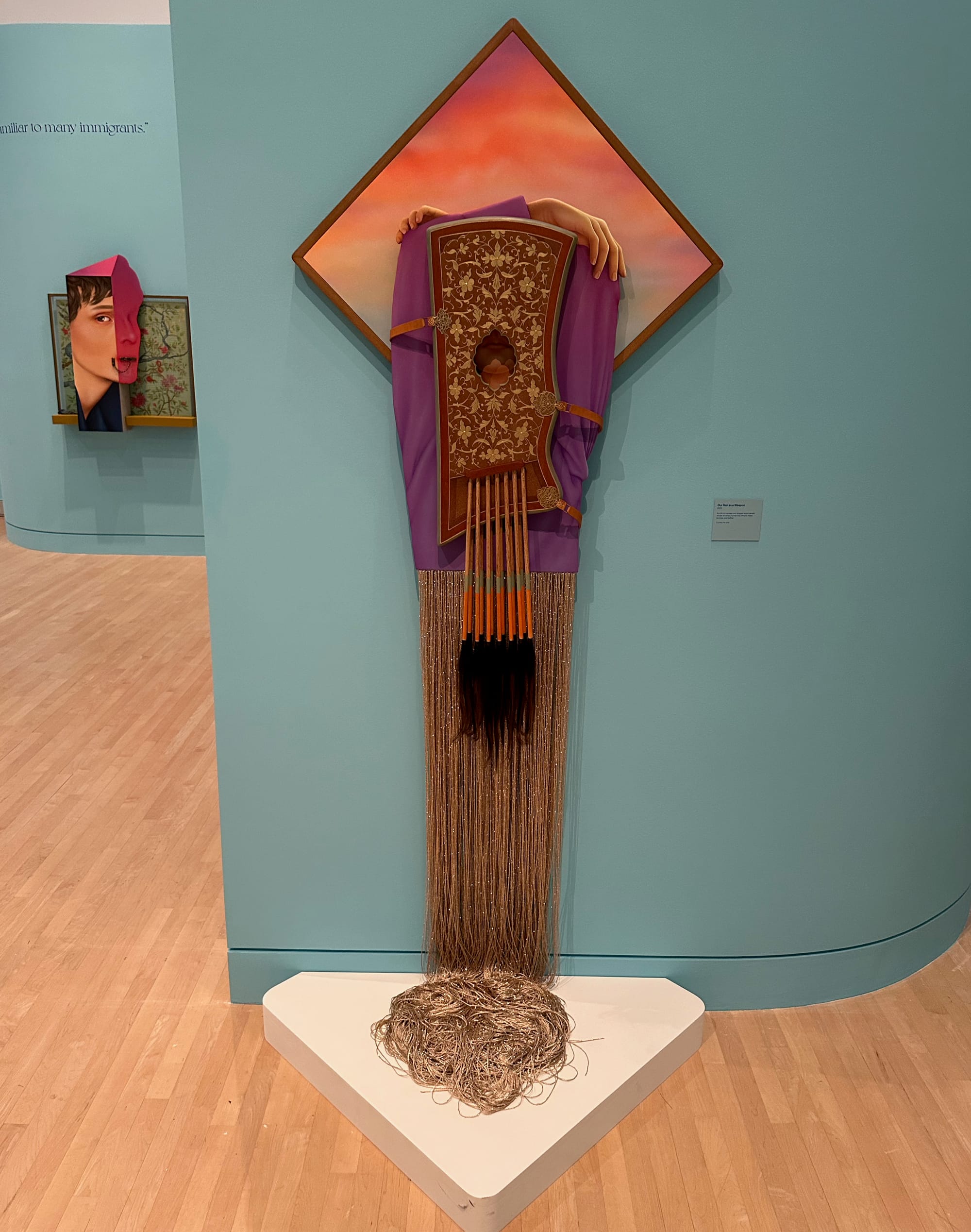 That feeling of wonder washed over me at Arghavan Khosravi’s solo exhibition at the Rose Art Museum at Brandeis University in Massachusetts. In these predominantly wall works, Khosravi creates art that directly engages with the illusionism of traditional Persian manuscript illumination but infuses it with the feminist aesthetics of Marisol Escobar. With the latter Khosravi shares a love of what I’d describe as mimicry (paging Luce Irigaray), often echoing or copying historical items to transform them or exploit their weaknesses. In Khosravi’s art that means the juxtapositions often reveal the limits of singular images and they are always tending toward the artistic power of hybridity. She’s as much in dialogue with minimalist sculpture and second-wave feminist art as she is with museum-style displays or even the clutter of junk and antique shops.