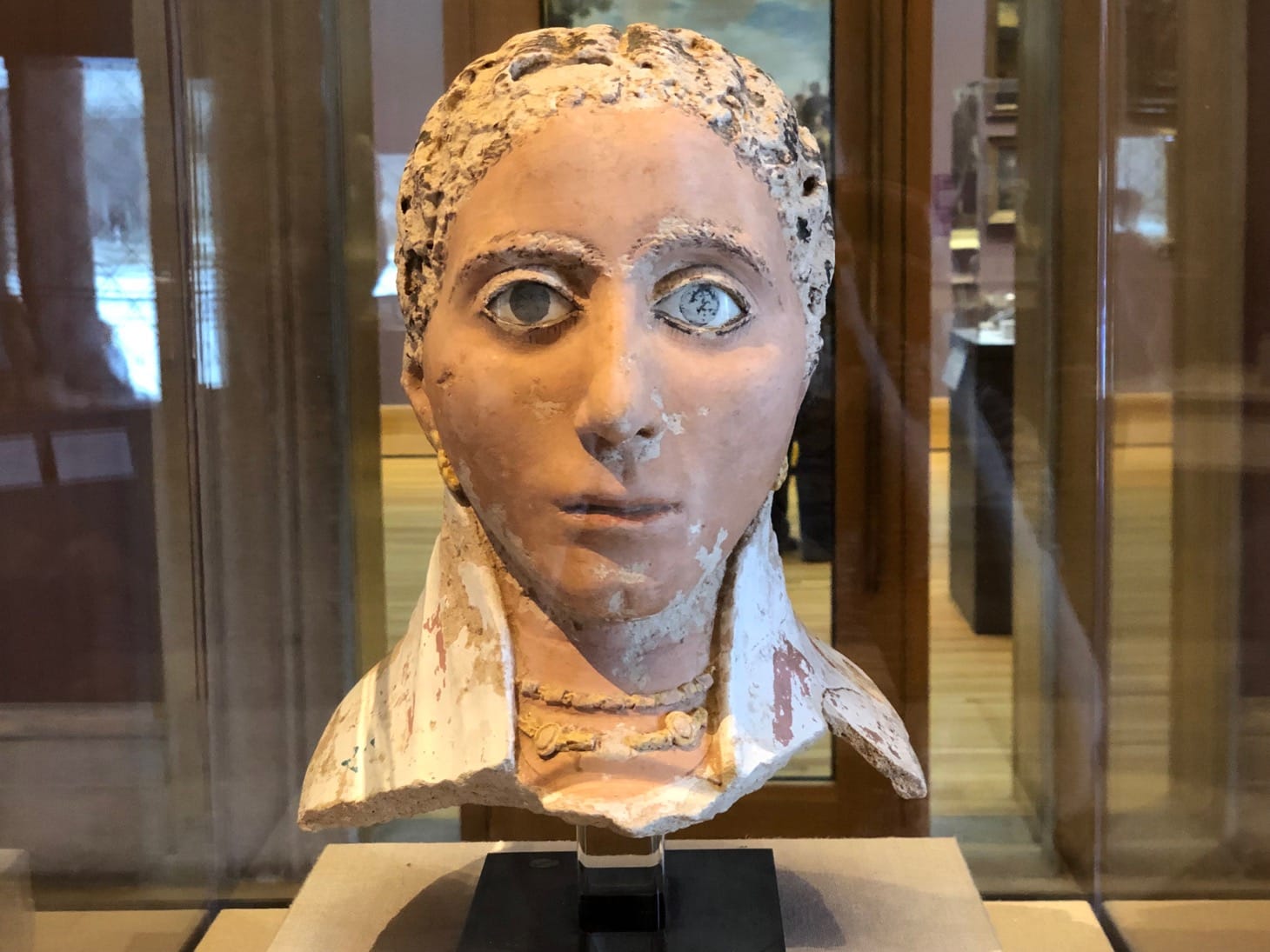 In the Round models Praxiteles’ encouragement of emotion by displaying the exhibition’s sculpture, ceramics, and busts with plenty of space provided to walk around them and inspect closely — without actually touching. Many smaller objects such as figurines and coins are displayed in clear cases upon a podium, which means visitors can circumnavigate as they wish and point out small details, such as lines indicating the figurines were made from two molds. Viewers see perfection and imperfection in equal measure; new details draw the eye. The delicately drilled hairstyles upon sculpture or the symmetrical braids on a plaster mummy mask become the new focus, rather than the piercing eyes or cleft in a chin.