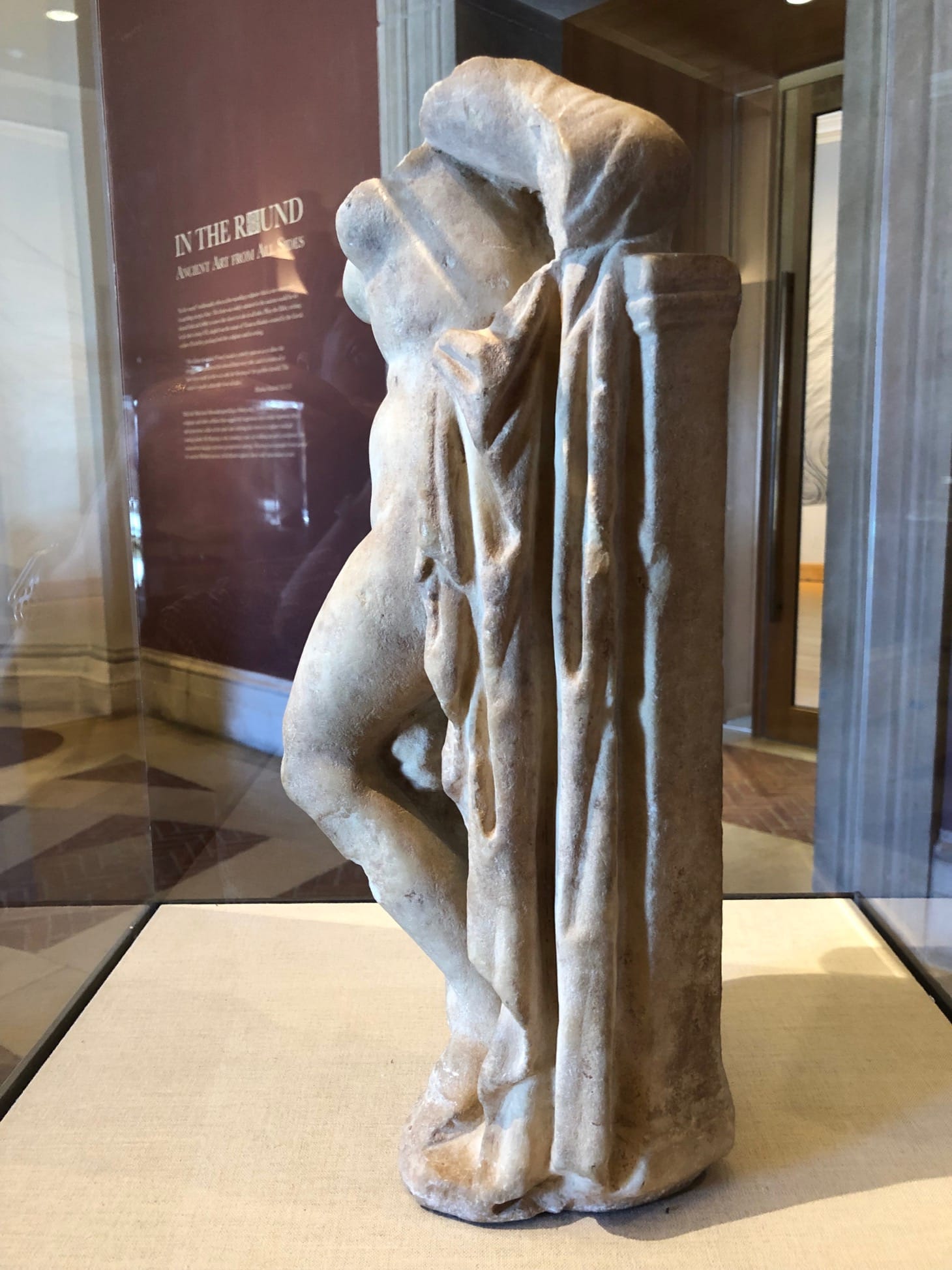 A new exhibition at the Bowdoin College Museum of Art on until October aims at seeing ancient art from untraditional angles and all sides. In the process, the exhibition subtly underscores and then critiques the consequences of the display choices made by museum curators. In the Round: Ancient Art from All Sides was curated by James Higginbotham, Associate Professor of Classics and Curator for the Ancient Collection at the museum. As the show’s signage notes, “in the round” is a phrase usually used to refer to free-standing sculpture. The first-century Roman magistrate and natural historian Pliny the Elder noted that the famed Attic sculptor Praxiteles (395–330 BCE) had his Venus (also known as the Aphrodite of Knidos) displayed so that it could be admired in full view: “The little temple in which it is placed is open on all sides, so that the beauties of the statue admit of being seen from every point of view; an arrangement which was favored by the goddess herself, it is generally believed.”