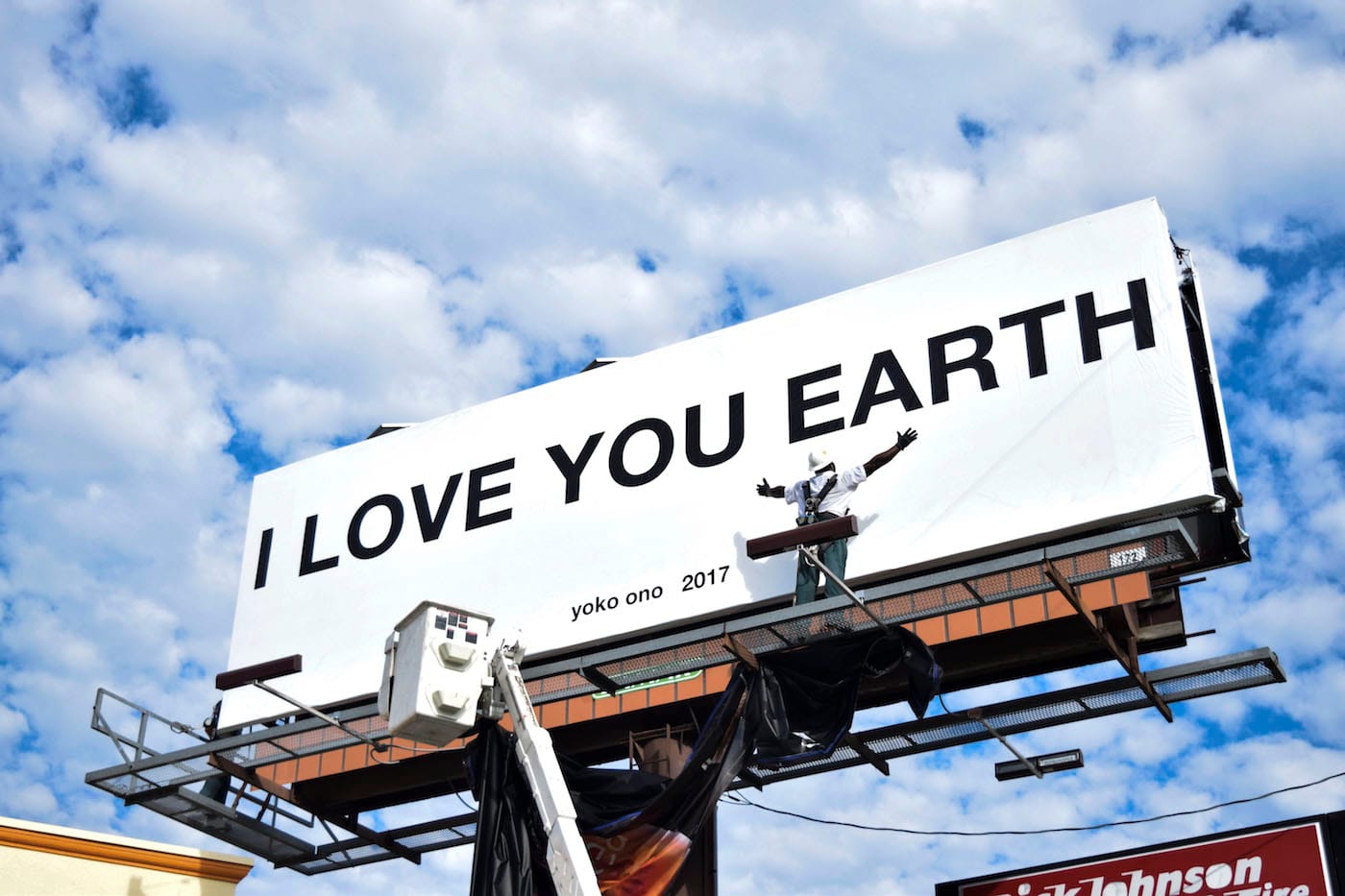The term “Fluxus” first appeared in 1963 as part of a manifesto by George Maciunas, who demanded that the movement’s artists “purge the world of bourgeois sickness … PURGE THE WORLD OF ‘EUROPANISM.” It’s interesting to revisit the creative, innovative movement now, in the midst of what feels like a dystopia. For the show, Yoko Ono has created a billboard reading “I LOVE YOU EARTH,” in stark black on a white background, a few miles from the gallery.