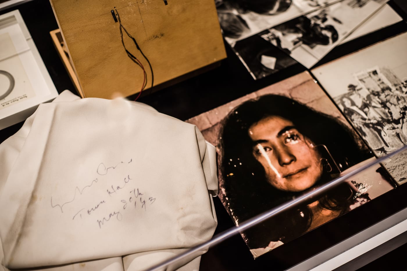 In addition to artwork, instruments, and compositions, there are photographs and letters; there’s the metal pot that Captain Toby of the South Brunswick police force shot with a submachine gun, before precisely shooting at pages of sheet music to create a bullet composition — as requested by Dick Higgins for his series, The Thousand Symphonies. There’s a delicately slumped bag from John Lennon and Yoko Ono’s bagism performances sewn from their wedding night bedding (bagism involved draping an actual bag over the body; inside a piece of cloth one couldn’t be judged on the basis of one’s skin color, gender, clothing, or age). The show is a collector’s playground, and if you ask, no piece is without its own story — it took Dellinger years to source them all.