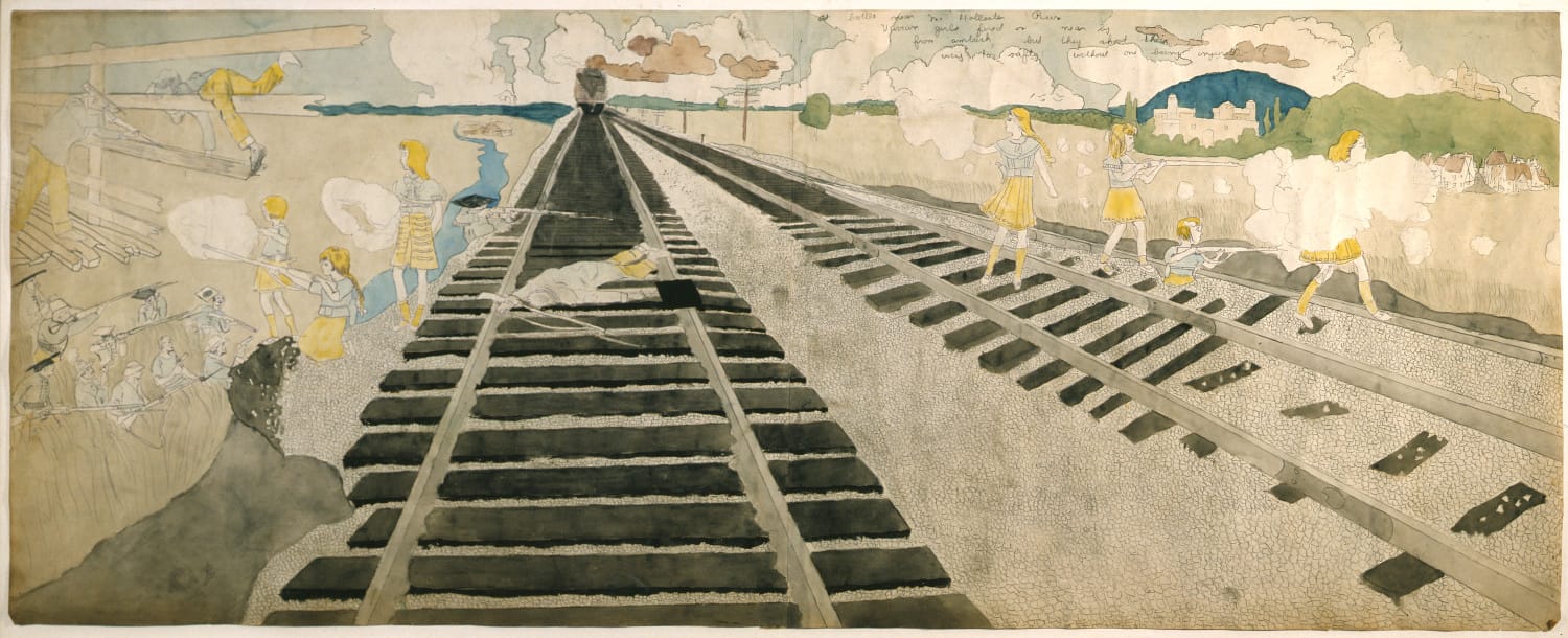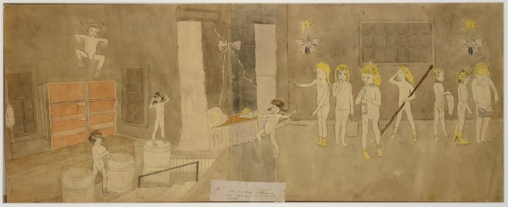 The Vivian Girls are the seven, valiant sisters at the heart of the complex story that has become known, for short, as “In the Realms of the Unreal.” In it, the girls are princesses of Abbieannia, a Christian land; they take part in a revolt against the child slavery imposed on their world by sinister forces, including monsters. In various episodes of the story, children fight with weapons to defend themselves against their foes. Often they are strangled, tortured or killed. In the show, the large drawing “At Wickey Lasinia. Are Placed in a Death House” (circa 1940-1950, mixed media on paper) shows a group of naked, intersex girls apparently trapped in a storage room. Another, “At Battle Near McHollister Run” (mid-20th century, watercolor and pencil on paper), depicts the Vivian Girls, clothed and toting rifles, in a shootout across railway tracks with men in a trench.