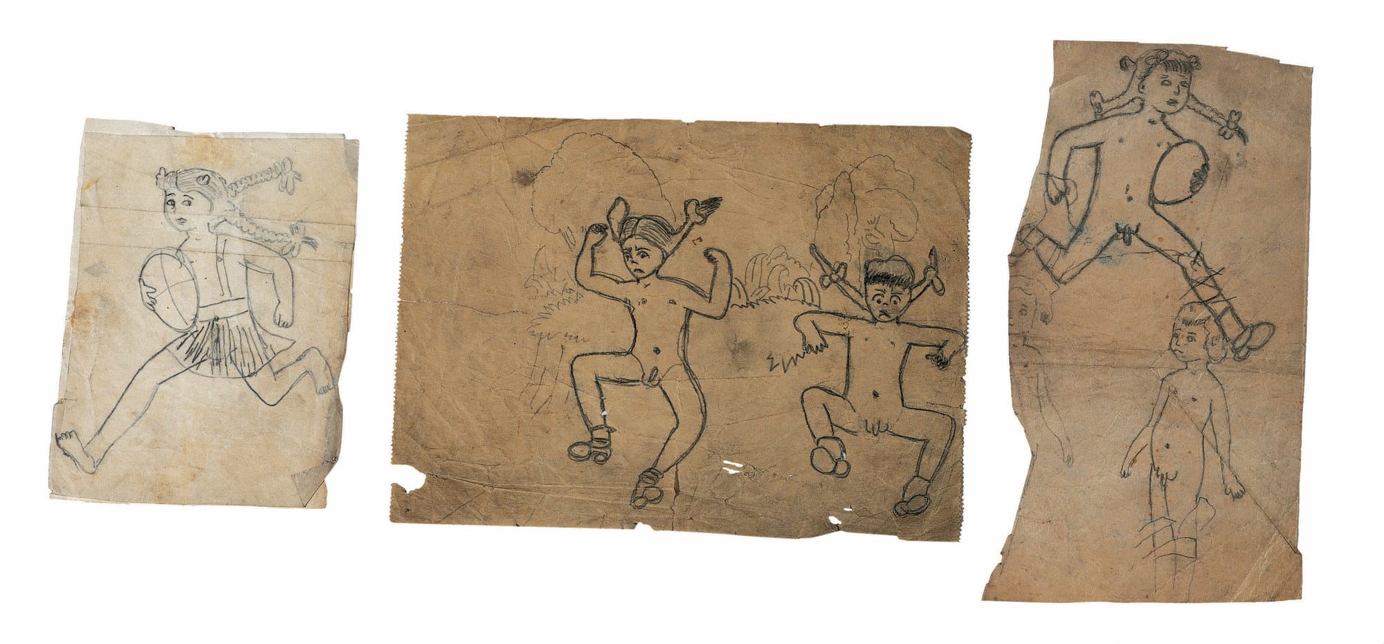 Darger filled more than 15,000 typewritten pages with that grand narrative, for which he created some 300 watercolor-and-collage illustrations. Some are several feet wide and double-sided; they have the visual impact of antique, painted scrolls, and their panoramic scenes have a cinematic quality, too. Several of these elaborate, double-sided pictures are on view in the current show, along with rarely seen examples of Darger’s study sketches of his young, female characters, and his individual portraits of the Vivian Girls.