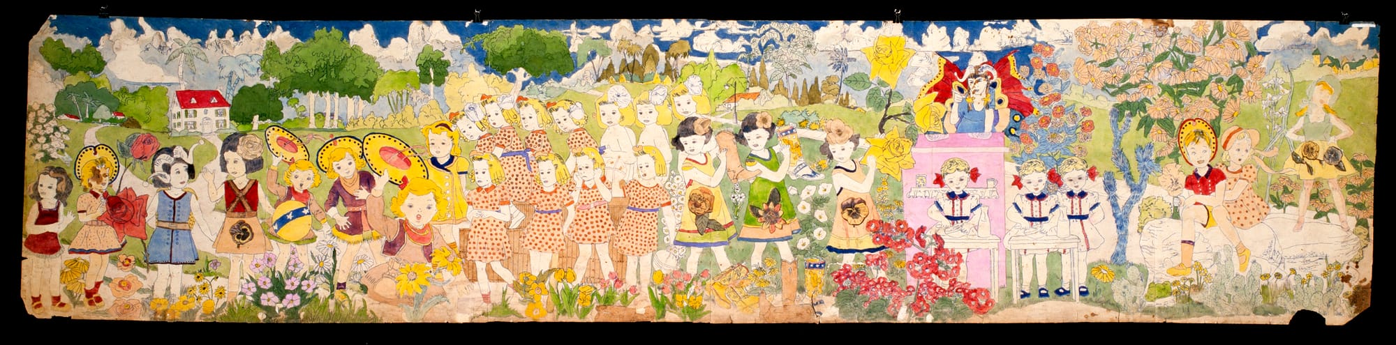 That more innocent spirit of the fantastic and the idealized is what pulses through a colorful, undated, and untitled drawing on loan from the American Folk Art Museum in New York. It shows a multitude of clothed girls, some sporting identical dresses, playing and enjoying the splendors of a sunny, idyllic, flower-filled garden, reveling in each other’s company and savoring their girlhood. Another work on view, “At Wickey Sansinia” (mid-20th century, the verso of “At Battle Near McHollister Run”) shows a group of girls in matching gray frocks and blue hats frolicking on a patch of grass between two paths stretching into the distance, toward a blue sky filled with fluffy clouds, bright light — and possibility.