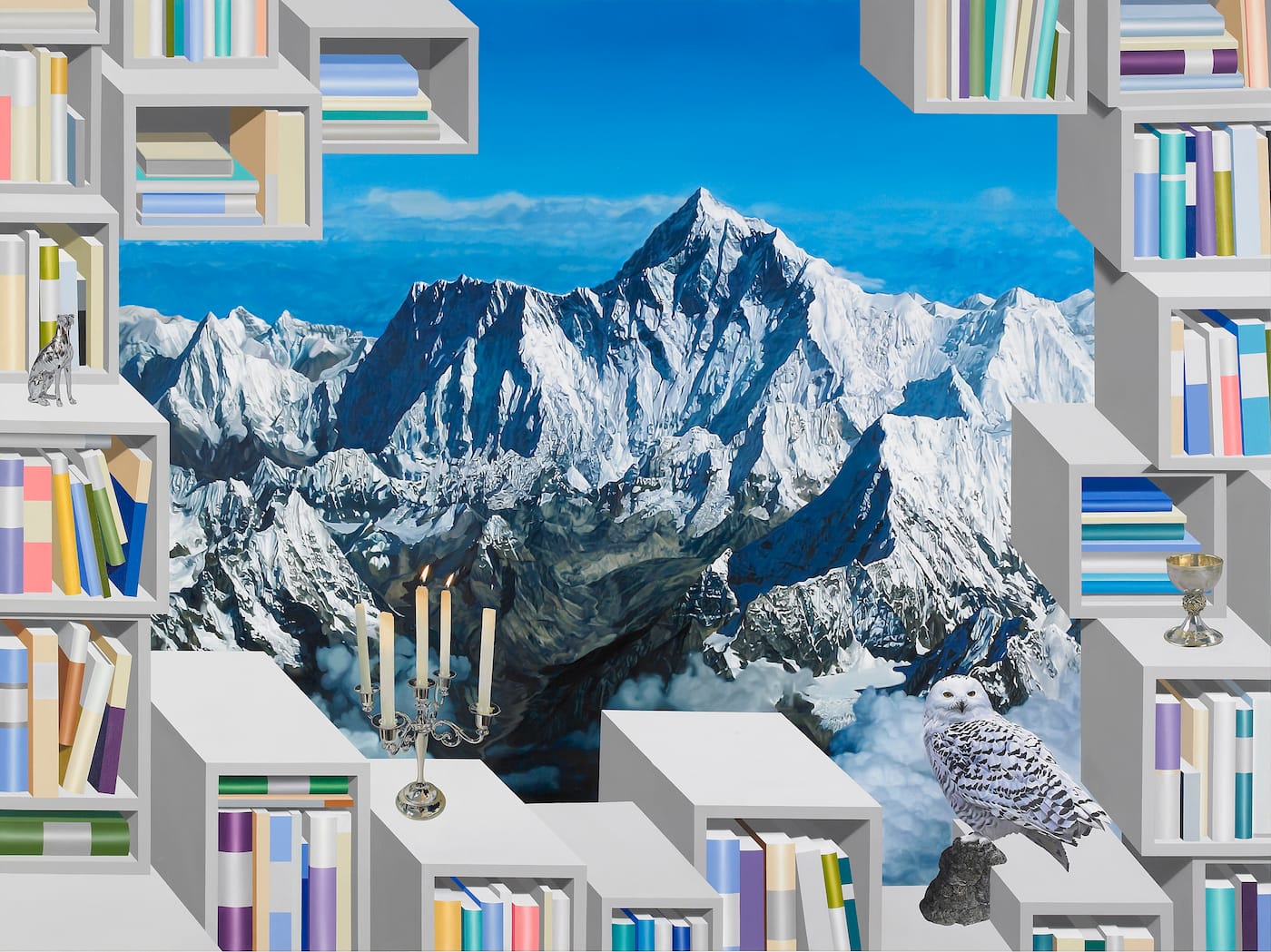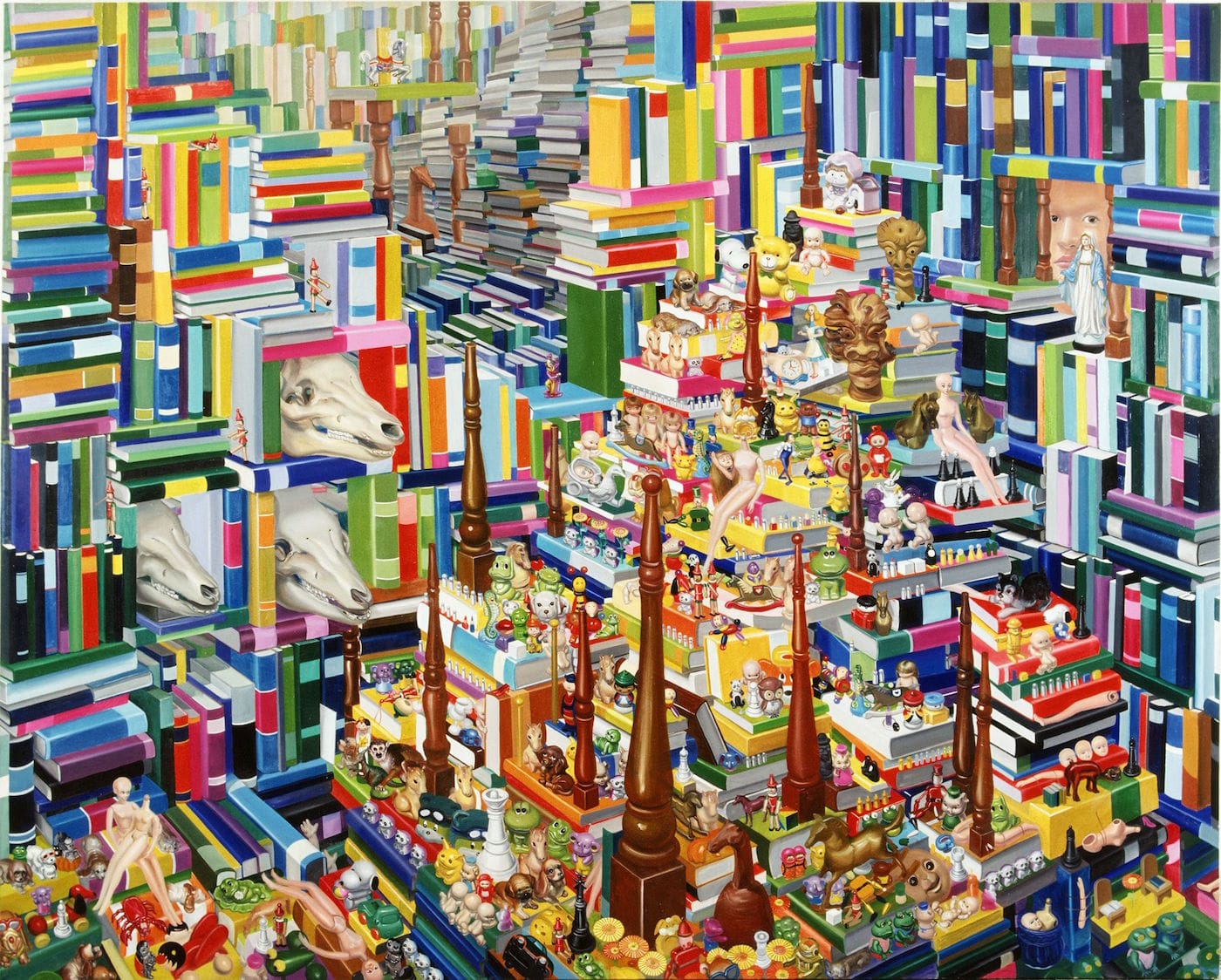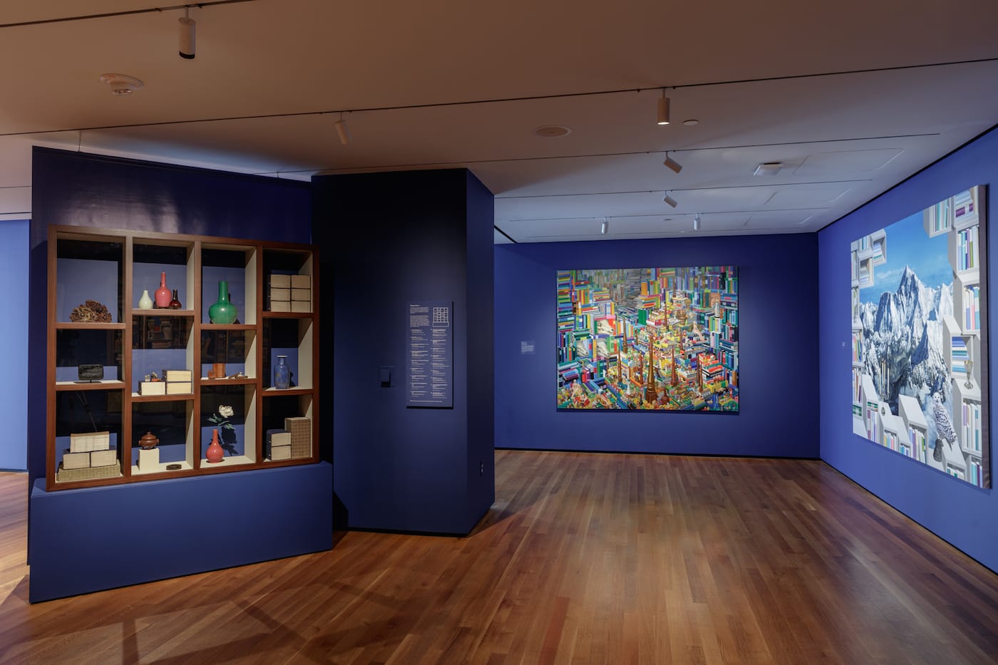 The exhibition makes this distinction clearly, dividing the two aesthetics of chaekgeori into separate sections. A third part of the show offers something quite different: a glimpse of the art form today, with a spotlight on two works by Seoul-based painter Kyoungtack Hong, which are painted on a single canvas rather than on a screen. Stacks of books structure each space, but the results show mind-bending, fantasy worlds: one centers on a photorealistic image of Mount Everest framed by a library; the other is a dizzying cavern of books filled with toys and animal skulls. Hong’s work attests to the enduring allure of chaekgeori, which continues to be painted today — albeit with contemporary luxury goods such as boxes of Tiffany jewelry and Gucci products.