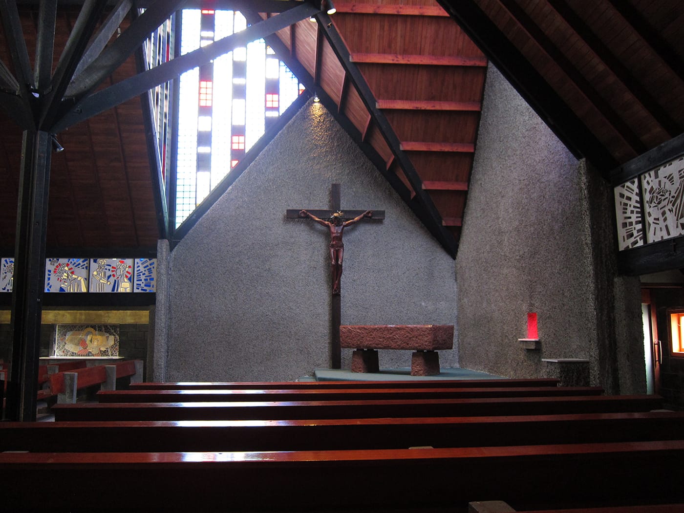 From the beginning, Futuna was built for a very specific purpose: as a haven for the Marist community. It’s named for the 30-square-mile Futuna Island in the Pacific, where the Marist priest and martyr Peter Chanel was murdered in 1841 while on a mission. It was even built by Marist brothers, who, though unskilled (and unpaid), broke ground in 1959 and successfully realized Scott’s design with the aid of volunteers from nearby Catholic communities. As architect Chris Cochran recounts, Scott was actually not the order’s first pick; when the brother who was initially chosen did not produce an innovative enough design, he suggested Scott, who proposed a vision focused on the interplay of light and shadow.