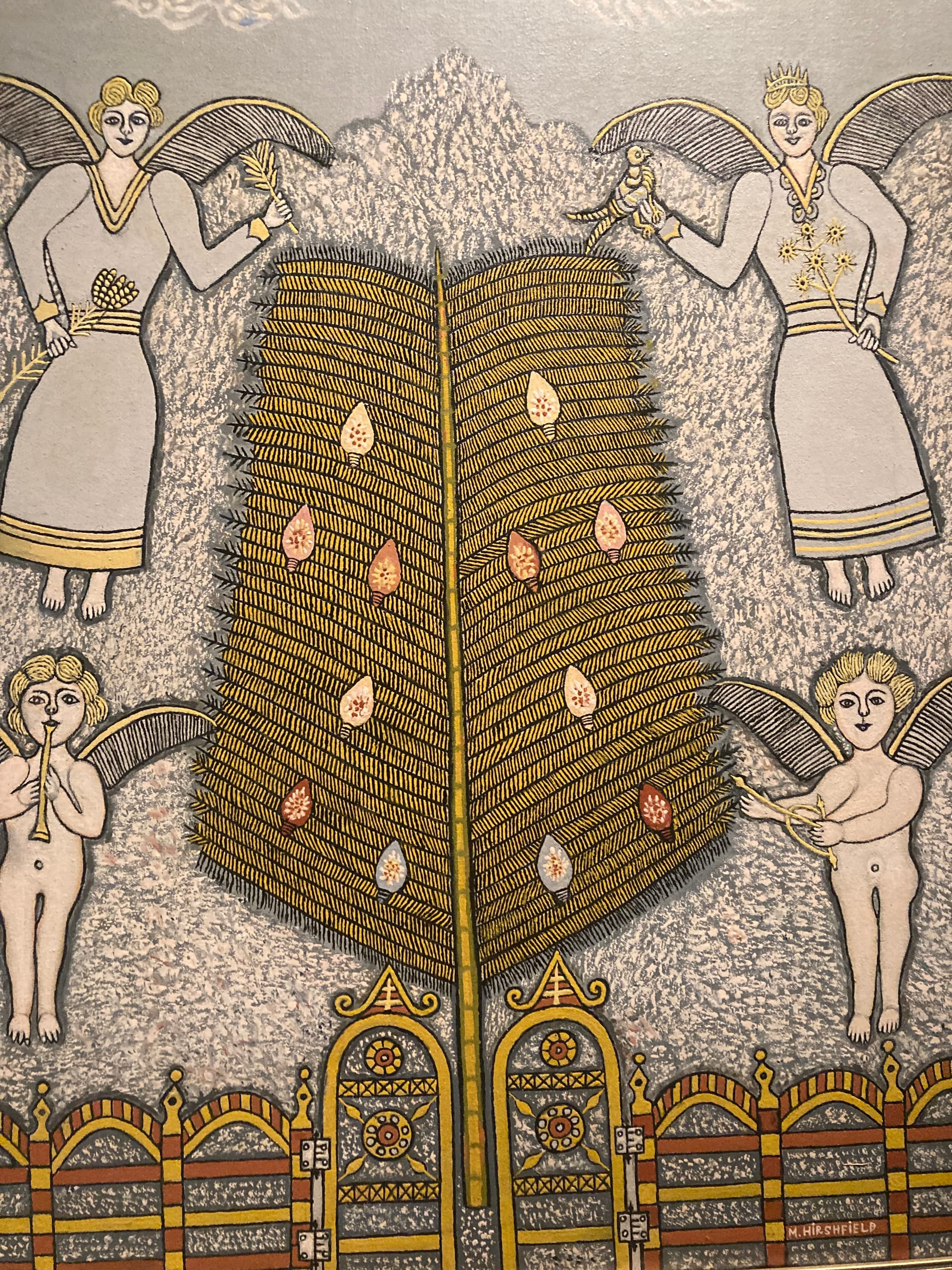 Other works like “Christmas Tree and Angels” (1946) also raise questions: Why would an observant Jewish immigrant render overtly Christian imagery? Fortunately, exhibition curator Richard Meyer probes more deeply into Hirshfield’s biography while offering insightful interpretations on the artist in The Master of Two Left Feet (MIT Press, 2022) for those who want to explore more. Despite not fully engaging every concern its presentation raises, Morris Hirshfield Rediscovered elucidates the legitimacy of Hirshfield’s aesthetic, showing the need for more research on twentieth-century self-taught American artists, who, like Hirshfield, were marginalized by restrictive art historical narratives.