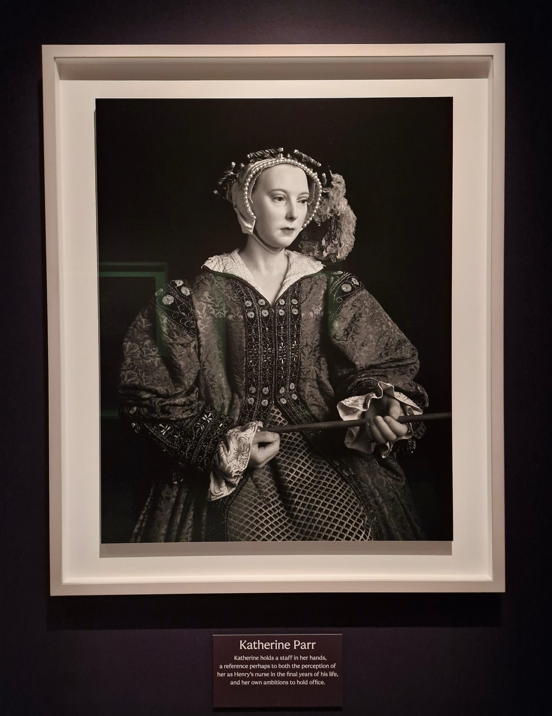 Perhaps this section’s most intriguing works are a sequence of images by the celebrated contemporary photographer Hiroshi Sugimoto, which juxtapose 1980s waxworks of the queens with attributes such as staffs or musical instruments. Their poses mimic their Tudor-era representations, but Sugimoto includes their lower bodies and arms, shown in action, lending them a degree of apparent agency. These photographs also encapsulate the exhibition’s overarching message, that we “use stories and our imagination to read portraits and bridge time.”