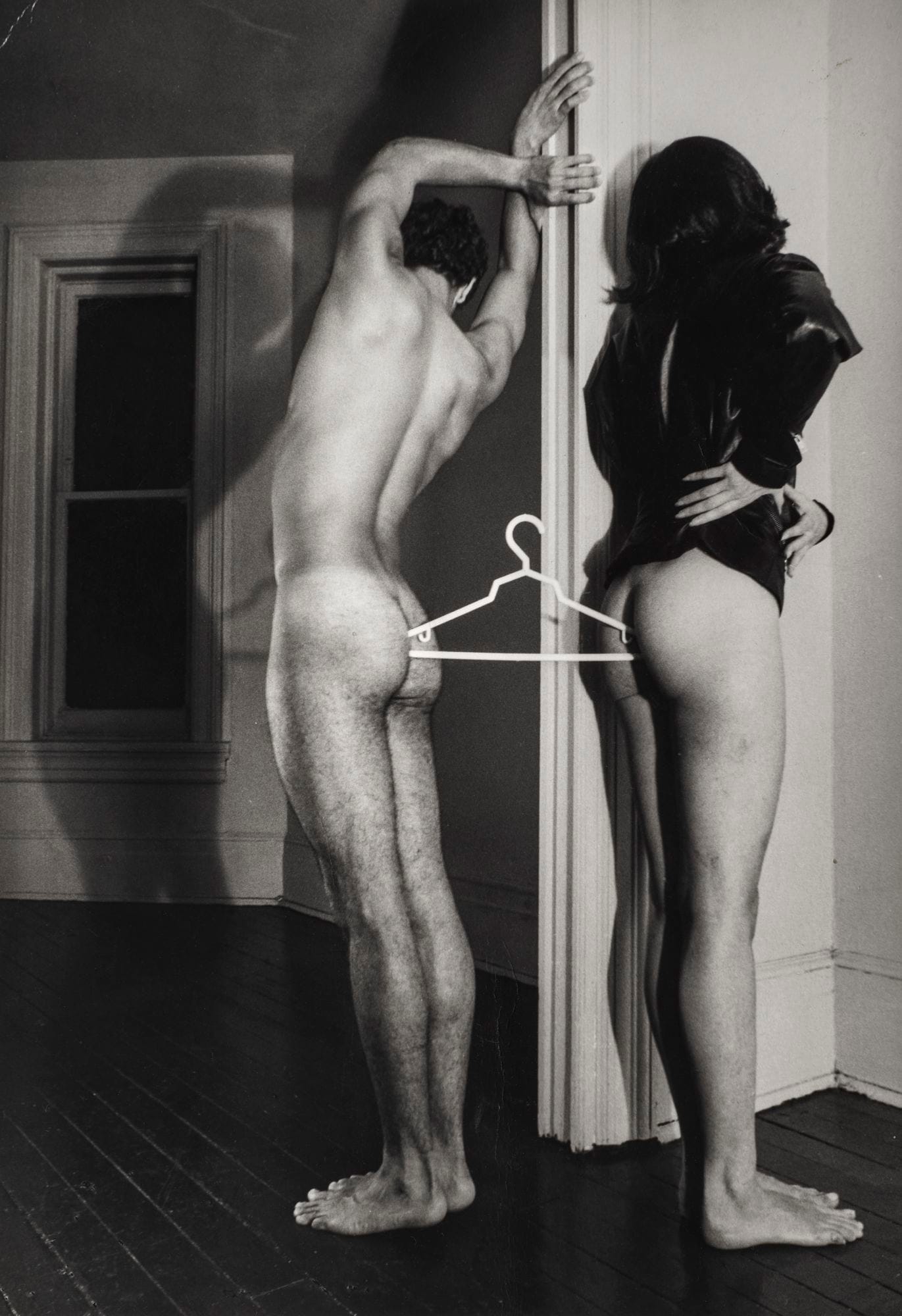 DeSana’s work goes far beyond its transgressive, anti-institutional subject matter; the artist had a gift for defamiliarizing the body without dehumanizing it. In his early series, 101 Nudes, he illuminates his subjects with a harsh flash, showing their bright white bodies from unfamiliar yet intimate angles. Their fluidity stands out, at odds with the bland suburban backdrop, but the models’ comfort with the camera can make viewers feel like co-conspirators in the act, as if we are complicit in their rebellion. In two different images titled “Coat Hanger” (1979 and 1980), two models hold the opposite ends of a shared coat hanger between their buttocks. There is an obvious provocation to the gesture, as the coat hanger symbolizes the dark undertones of domesticity and sexual oppression, but at the same time there is remarkable tenderness in the way that their bodies are lit and turned in contrapposto to create a protective shield of anonymity. As DeSana’s health declined and he leaned into abstraction, this power of unknowability became increasingly central to his work. The body blurs and transfigures itself in these later images, melding with fields of color, becoming flowers and rings, or a monumental abstraction of a broken oval — a gut-wrenching testament to his artistic perseverance, the beauty he saw in humanity’s ambiguity while experiencing its transience.