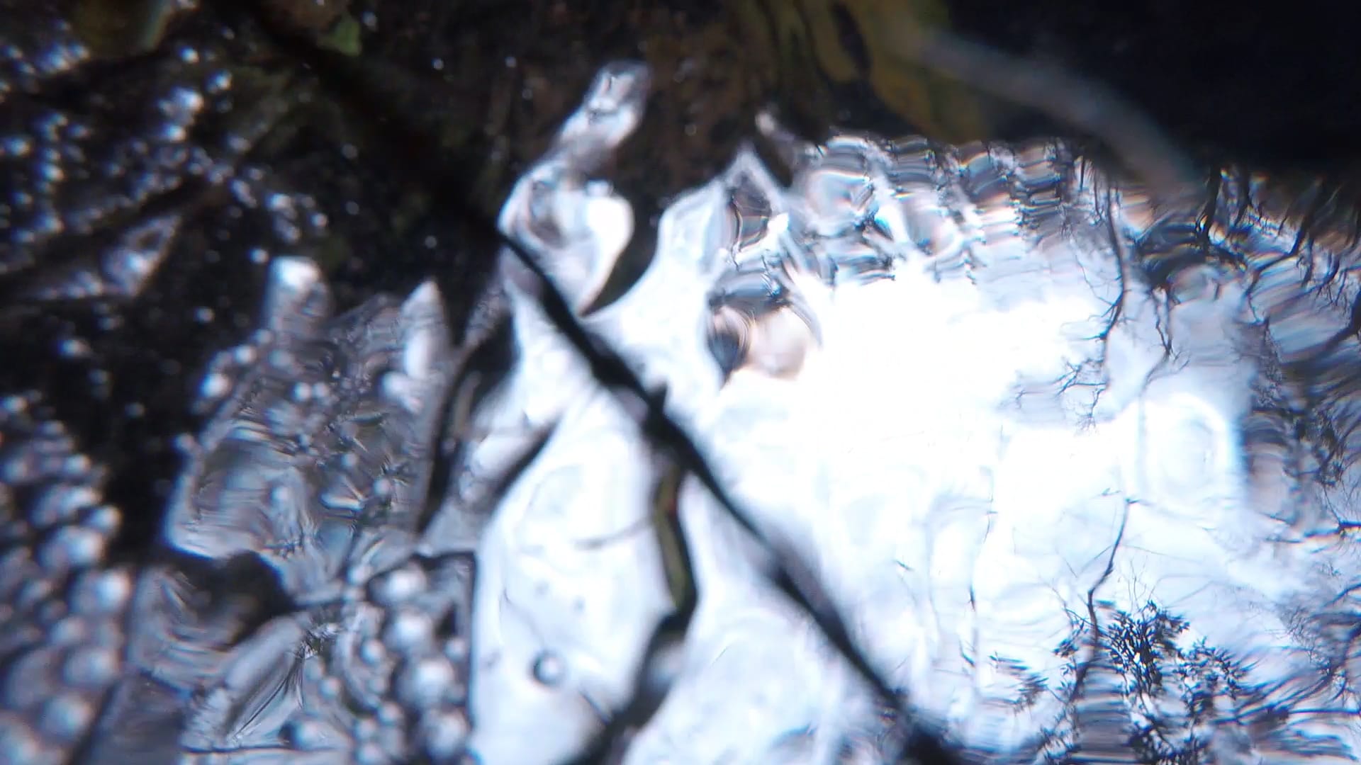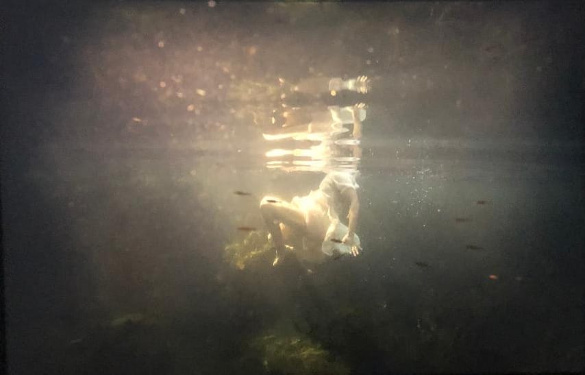 Before you even enter the room, the sounds of burbling water and flickers of light convey a sense of agitation. Two hanging yard signs covered with silver-painted palm fronds (“Metal Yard Sign with Sabal Palm Fronds I” and “Metal Yard Sign with Sabal Palm Fronds II,” both 2019) lend a portentous feel to the narrow entry hallway that conjures a crypt’s antechamber. Inside the shadowy main room, the menacing burbles grow louder as light flashes and river water rushes in Allison Janae Hamilton’s short film, Wacissa (2019). The film is projected onto the far wall and the adjacent walls’ corners. Its turbulent audiovisuals make it hard to discern up from down, water from sky, as if the video is simulating the experience of panicked and confused drowning.