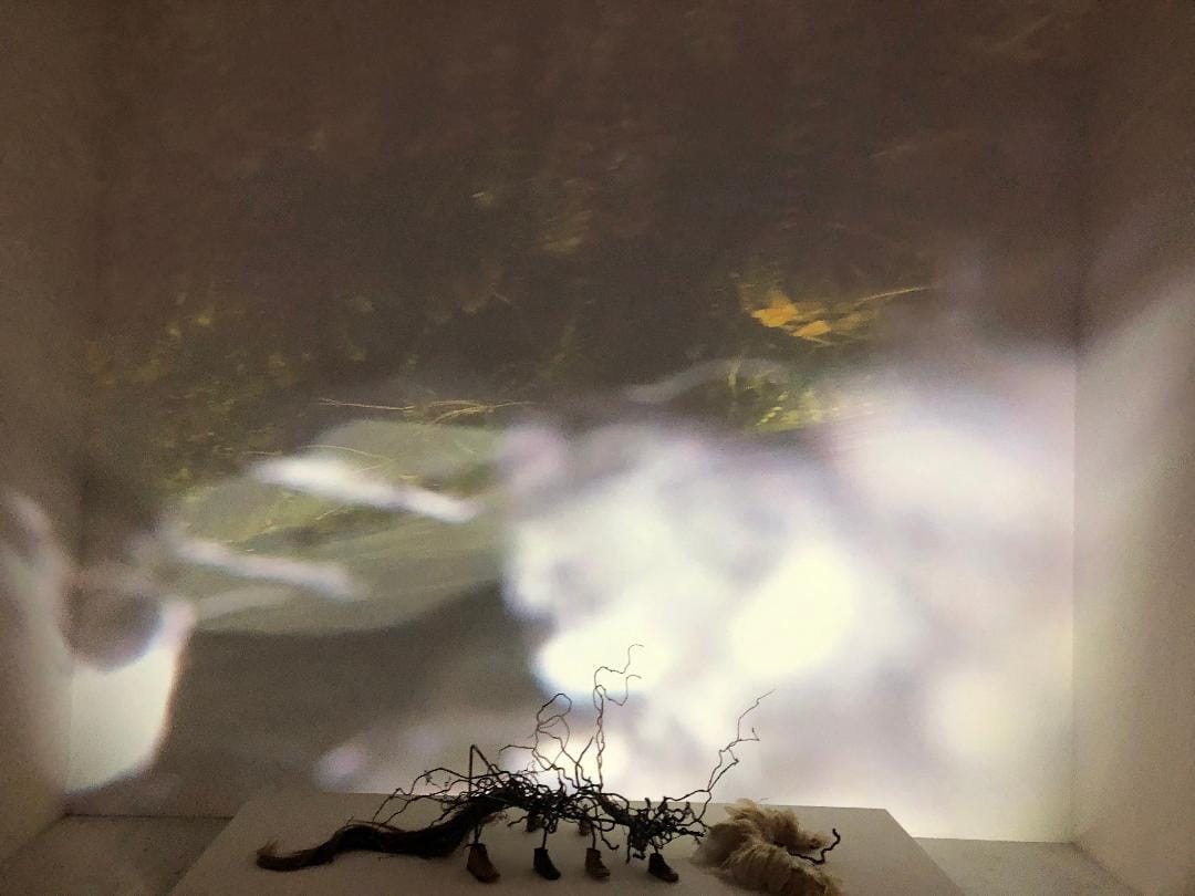 Hamilton’s mythopoetic contribution to Mood stands out for how much gloomier it is than her previous installations. Wacissa, in particular, is unrelenting: 20-plus minutes of whooshing swampwater, with only brief, sporadic audiovisual respites. Exiting back into the museum hallway’s stillness provides tangible sensory relief. The experience reminded me of artist Patty Chang’s comparison of art-making to what scientists call free-diving’s “struggle phase,” that is, the point at which the gasping underwater diver must either come up for air or relent and drown. Hamilton’s immersive installation allows visitors to wrestle with a mysterious land, its racial realities, and its mythic past, but also affords many the luxury — unavailable to those who live it — to extricate themselves from that struggle when it becomes too much to bear.
