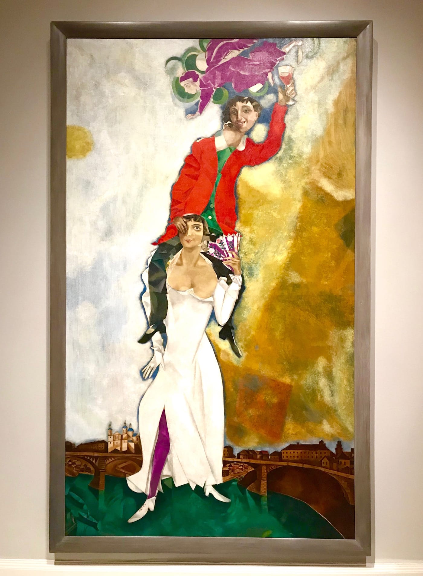 With his newfound citizenship, Chagall believed that the world’s opportunities were opening up for him and his family. He illustrates that elation in “Double Portrait with Wine Glass” (1917–18), depicting the artist drunkenly teetering on his wife’s shoulders as his spiritual baby body-double hovers above. A rush of warm colors and an unusually squat landscape evoke Chagall’s eagerness to see Russia’s revolution through. Even while balancing a husband on her back, Bella steps forward toward the viewer, perhaps toward a better future. She would remain Chagall’s primary muse for the next 35 years of their marriage.
