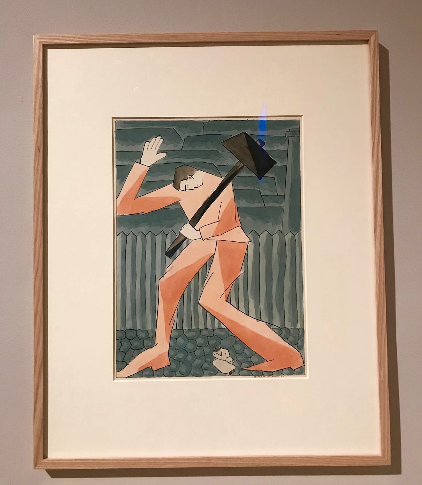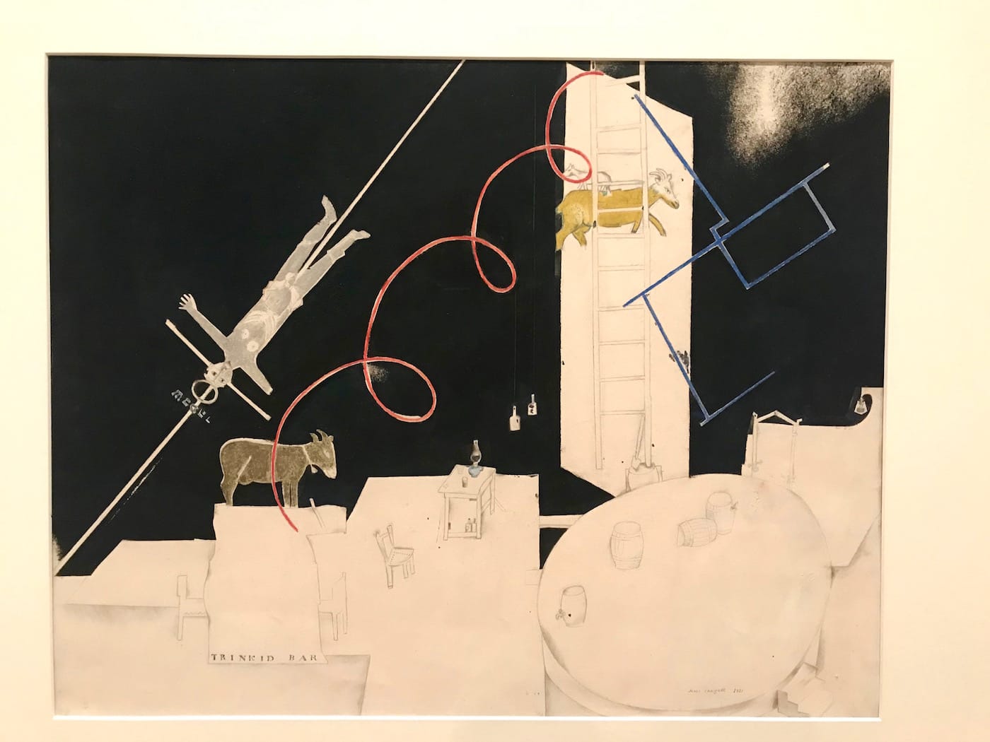 Though curators Claudia J. Nahson and Angela Lampe don’t account for the precise costs of friendship between Chagall and his Supremacist colleagues within the exhibition’s text, it’s quite clear that the former artist never acquired a taste for the Russian minimalist mode. After decamping from Vitebsk in 1920 for design work at the Jewish theater in Moscow, Chagall continued to use the shapes and squiggles of Suprematism in his work as a form of critique. Designs for plays like “The Playboy of the Western World” (1921) juxtapose the supposedly holier-than-thou geometries of Suprematism with goats and what appears to be a stupefied saint attached to a cross. (More likely, this “saint” is a reference to the main character of “Playboy,” Christy, a patricidal braggart who nearly kills his father twice.)
