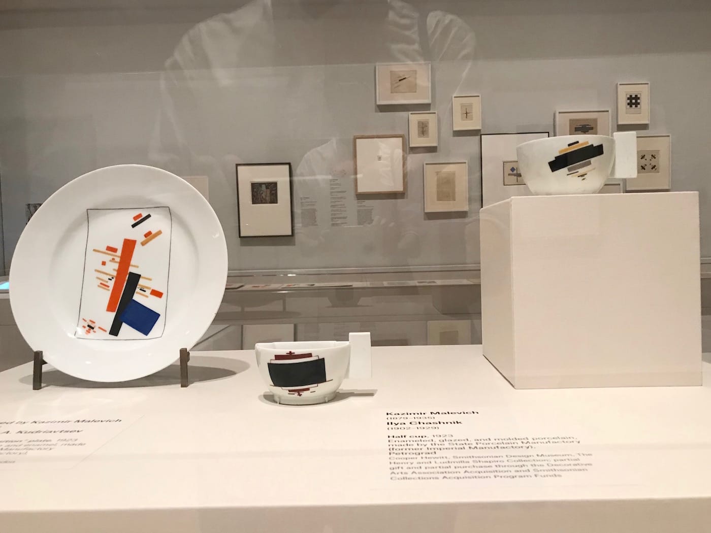 Suprematism’s detractors have long accused Malevich of invoking a “sermon of nothingness and destruction,” as one of the artist’s contemporaries, the Russian Symbolist Alexandre Benois, commented about Black Square. The Jewish Museum’s exhibition clarifies how much grander a scope Malevich had planned for the political and commercial aims of his art movement. The exhibition’s final gallery displays a series of drawings, prints, and pamphlets penned by UNOVIS that propose new designs for government buildings of the ascendent Soviet regime. For instance, “Project for the Decoration of Workshops for the Committee to Combat Unemployment” (1920), which was co-produced by Malevich and Lissitzky, demonstrates a particularly extravagant use of Suprematist geometries for what amounts to a bureaucratic design. At the center of the room, various teacups and plates show Malevich’s willingness to commodify his style as early as 1923.