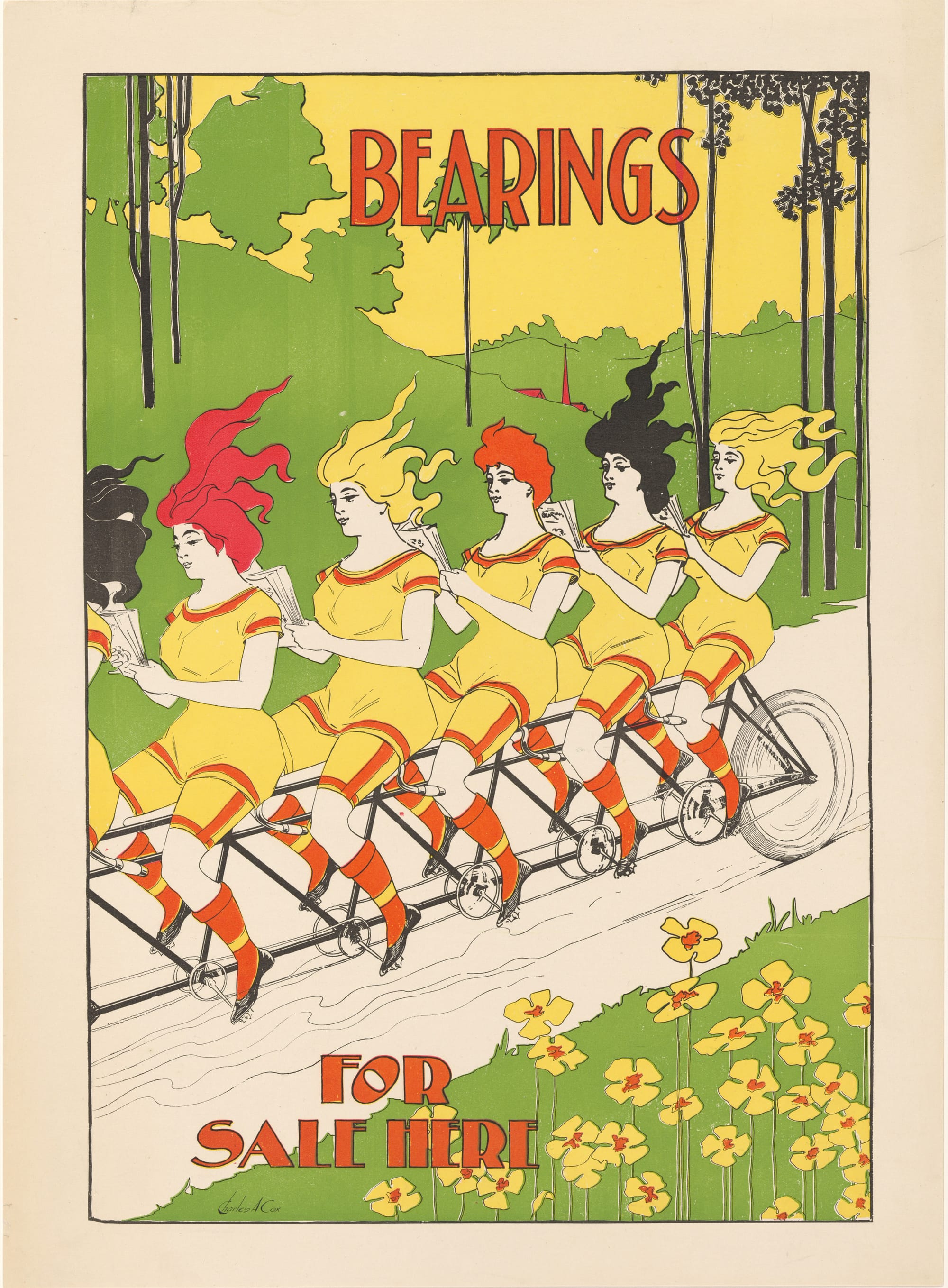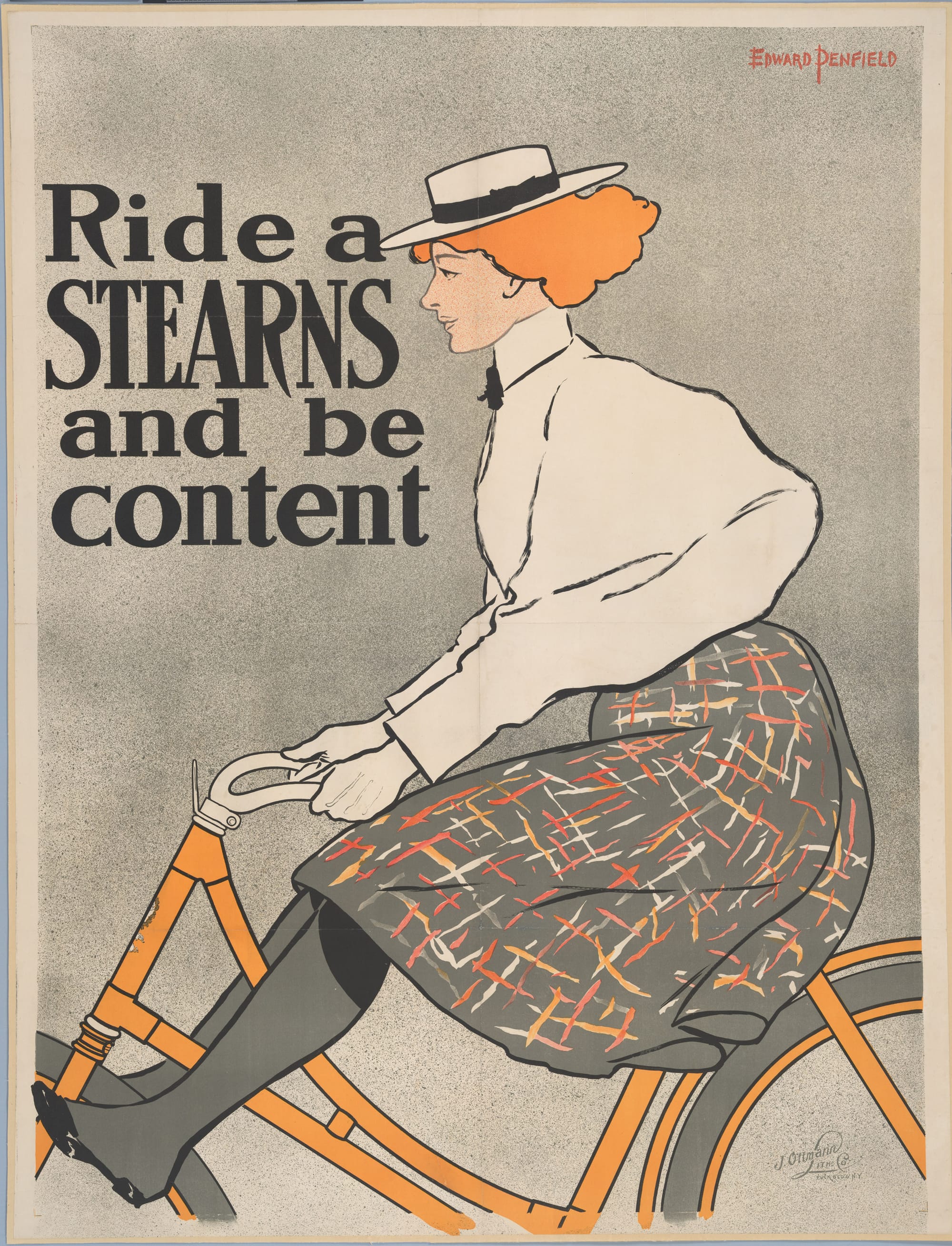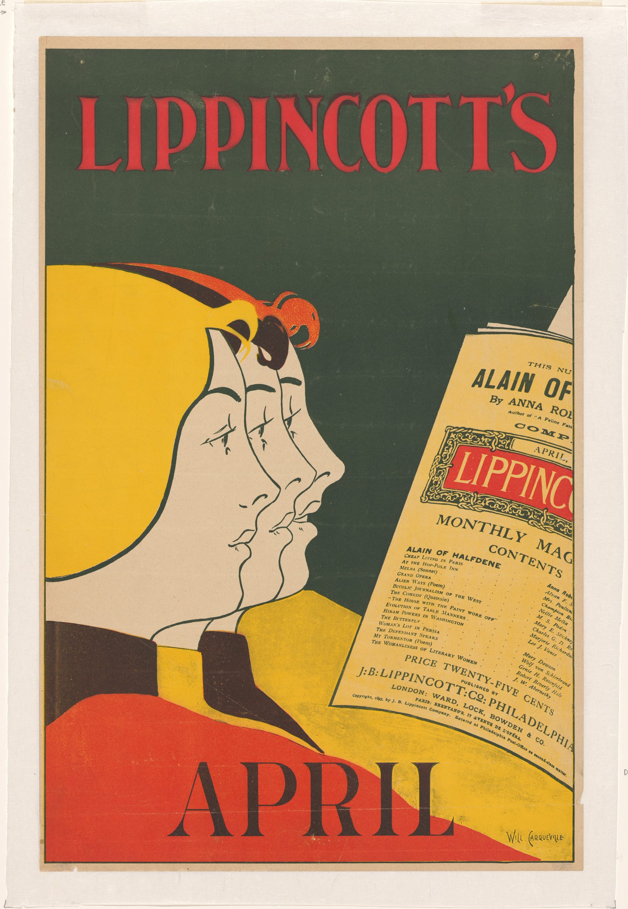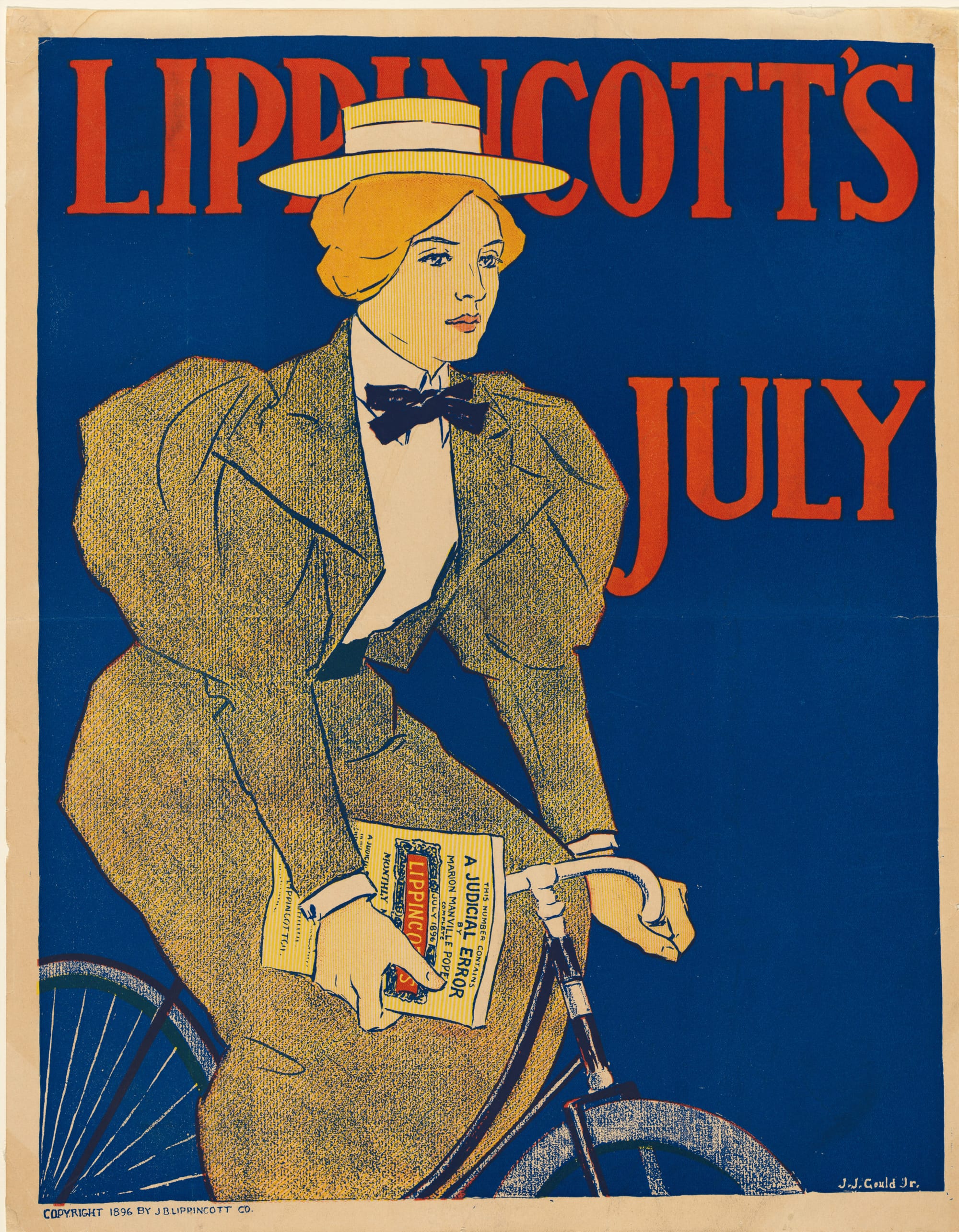 In her catalog essay, Rudnick examines a cover of the July 1896 issue of Lippincott's as the essence of the burgeoning form. Created by Joseph J. Gould Jr., the image features a woman in a day suit equipped with the exaggerated sleeve caps and narrow skirt of the era, perched calmly on a bike with a straw hat on her head, which partially obscures the masthead's bold red letters. She is biking out of a richly blue background, presumably off to enjoy the copy of Lippincott's held against the handlebars in her right hand. "The poster itself represented something new: an advertisement that looks and functions like a work of art," Rudnick writes, "an image made for public consumption in which commercialism and culture coalesce."