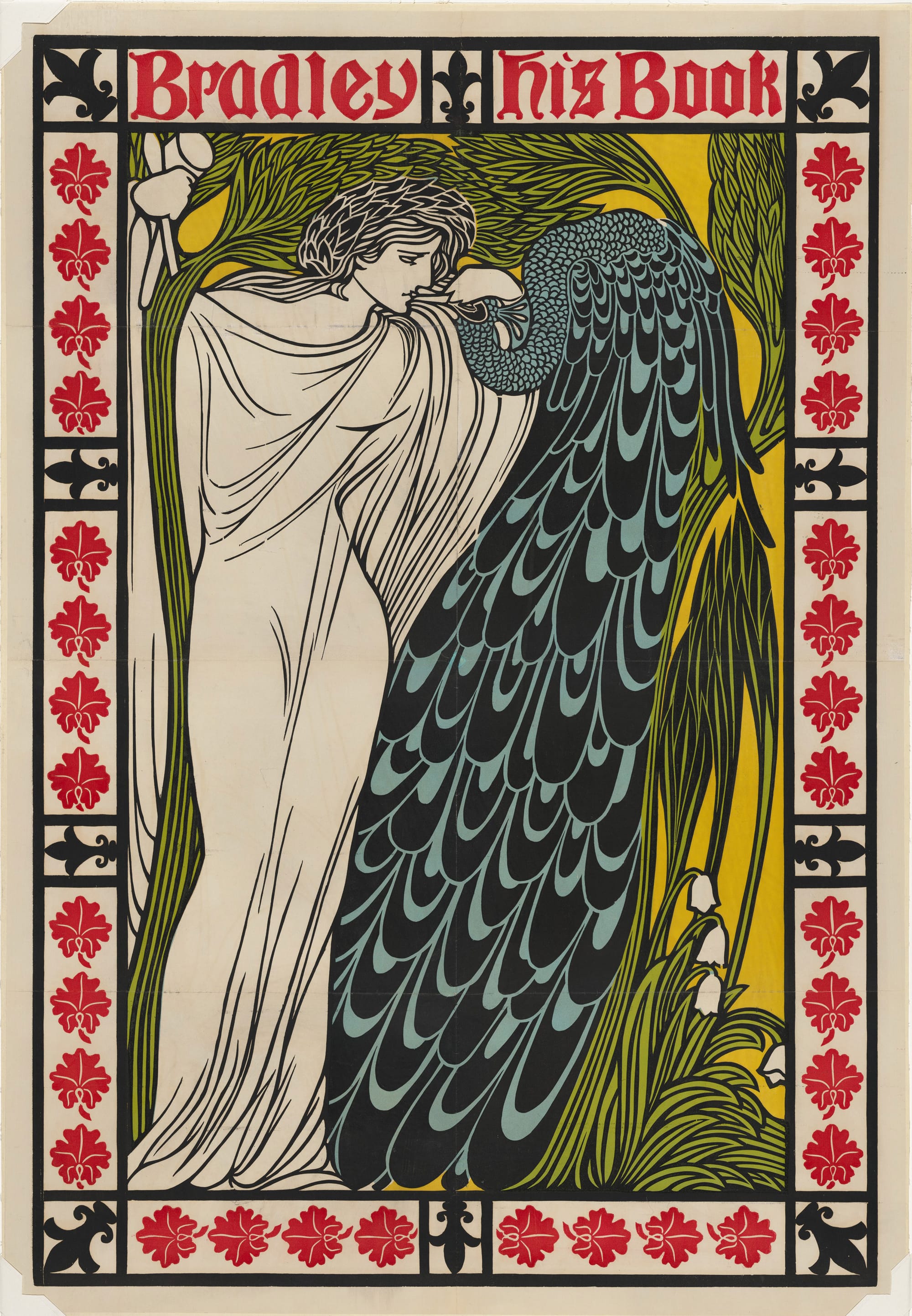 Turn-of-the-century literary journals like Lippincott’s Monthly Magazine and Harper’s were some of the first publications to avail themselves of this new technology, with cover art featuring thoroughly modern Gibsonesque girls riding bikes, snuggling cats, and of course, reading. Though the magazine and visual digest Bradley, His Book was only published between 1896 and '97, the cover works by Art Nouveau illustrator and film director William H. Bradley, its publisher, are dazzling examples of the intricacies made newly possible in literary art posters. One five-color cover, a lithograph and woodcut print titled "The Kiss," conveys a figure donning a head laurel and Romanesque flowing robes sharing an intimate embrace with a peacock, all bordered by a decorative frame recalling illuminated manuscripts.