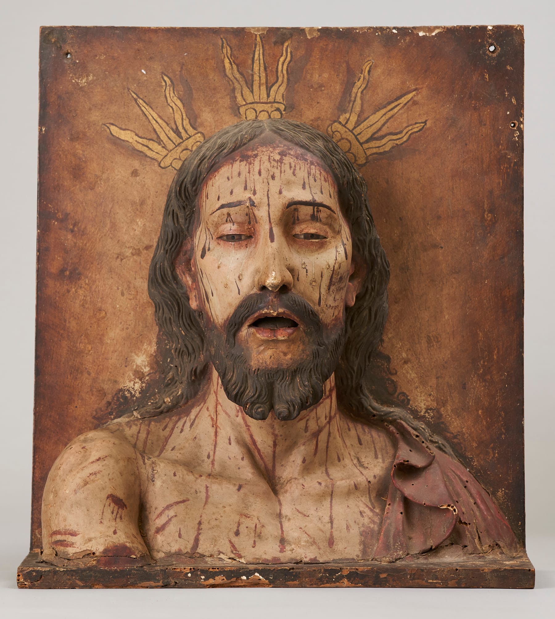 “Accessing the Divine” entwines physical and spiritual experience even further, focusing on Christian representations of divine suffering and love through images of crucifixion and self-abnegating devotion as well as tender (and, occasionally, stiff) familial images of Mary, Jesus, and St. Joseph. These works visualized the Holy Family’s humanity and Christ’s physical suffering for worshippers in tangible, relatable ways. Bell drew from the museum’s deep vault for the show, with 50 of the 62 objects in the exhibition on display rarely or for the first time. The finds include a cuddlesome terracotta "Madonna and Child," after Donatello, and several poignant objects from Mexico and North America, including a visceral, polychrome "Head of Christ" in the agonizing pose of Man of Sorrows, and a potent retablo of "Nuestra Señora de los Dolores/Our Lady of Sorrows." Bell points out that making art could be a tactile, devotional act in itself: an artist had to drive the arrows into a sculpture of the martyred St. Sebastian (since removed), while another recreated Christ’s stigmata with pegs on a carved New Mexican cross.