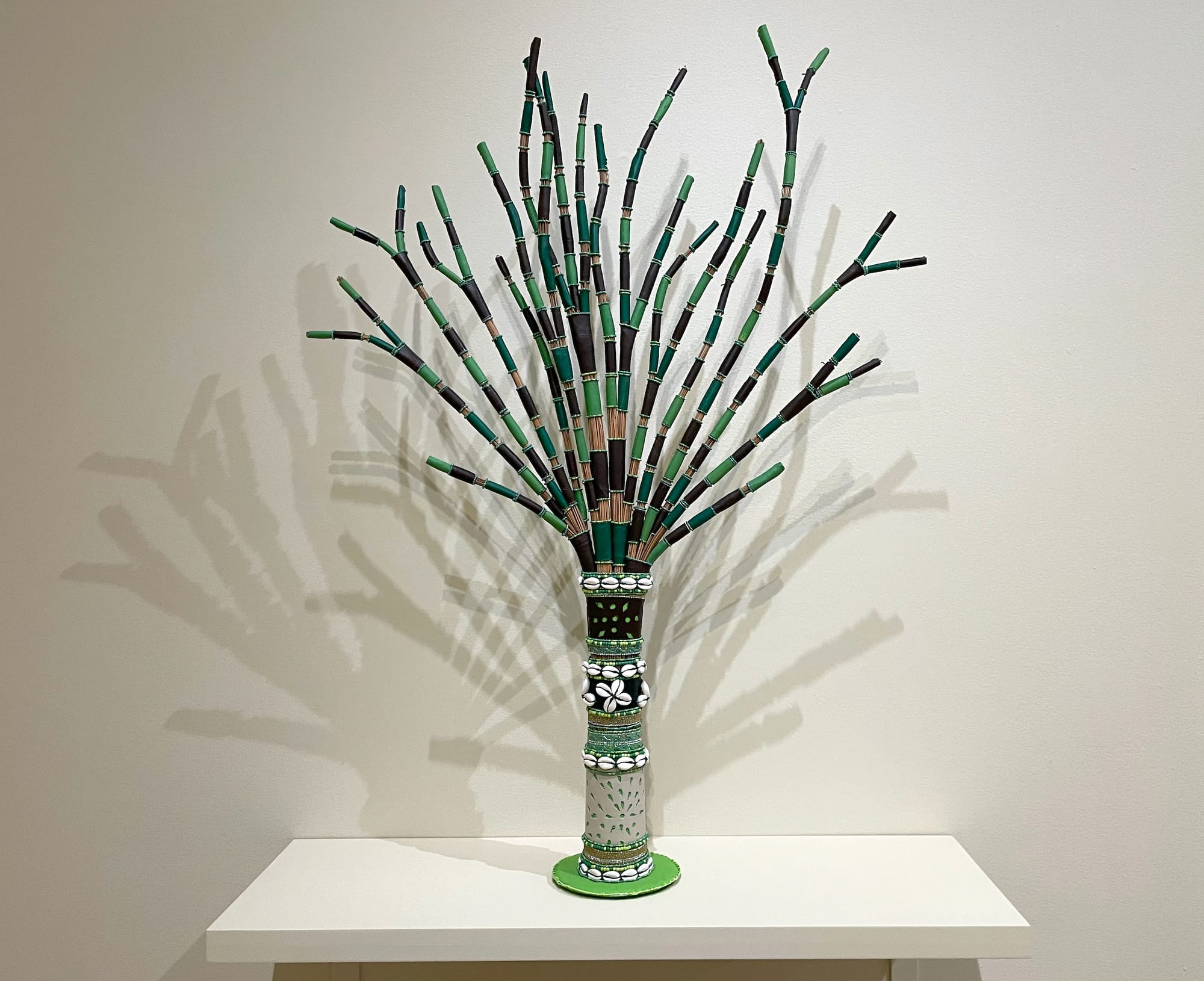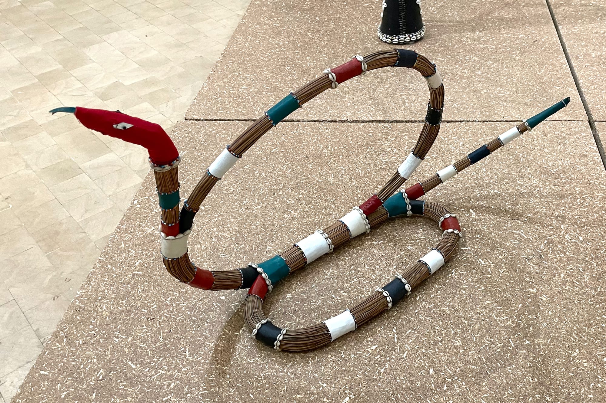 In “Ope Awo Ibo – Mysterious palm of the woods” (2004/2011), a base made of palm tree ribs adorned with red and black leather, along with beads and cowrie shells, gives way to a leaf-like blossom composed of multicolored fabric, sheltering a wild outgrowth of the plant. “Ejolorun” (1990), one of the few works that diverges from the totemic format, is a snake poised on the floor in a figure eight. The title refers to the Yoruba word for snake (“ejo”), while the serpent signifies the orisha Oshumare, who connects heaven and earth in Yoruba mythology. In other works, such as “Igi Nilé Ati Ejo Ori Meji – Tree of earth with two-headed serpent” (1990s), limbs branch off a central trunk and pirouette around one another in elegant nods to the relationship between the animate earth and the spirit in Candomblé cosmology.