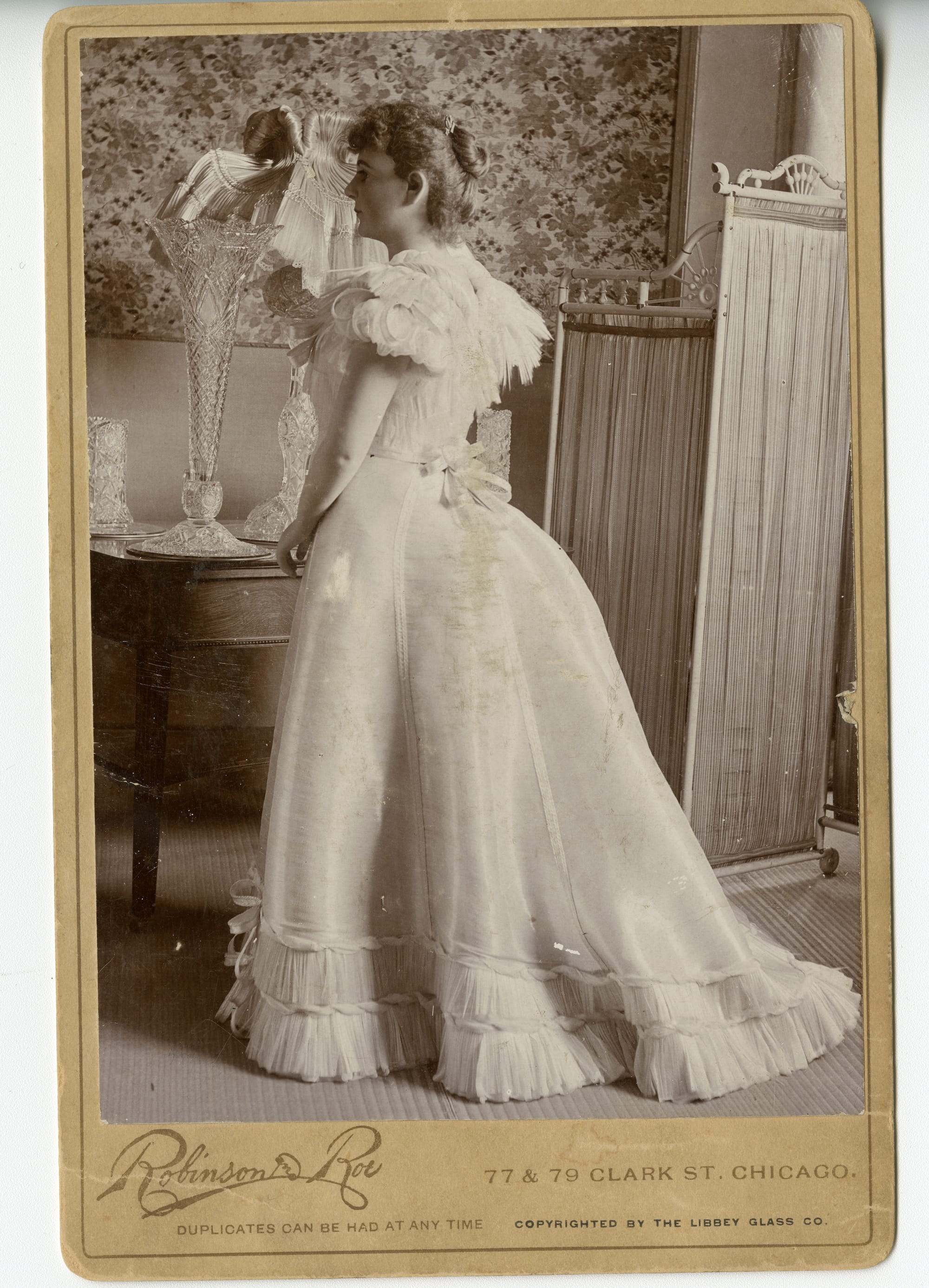 Though Cayvan had worn the dress to perform on stage before, it was naturally too fragile for practical use, earning a prized display spot at the Libbey Glass Company's extravagant exhibition space in the 1893 World's Fair in Chicago. Edward Drummond Libbey, who inherited the company from his father, had commissioned an elaborate, palace-like pavilion for the fair space that raised the eyebrows of his fellow board members, who were conscious of the company's fragile finances since an inexpensive glass variant had begun to rise in popularity.