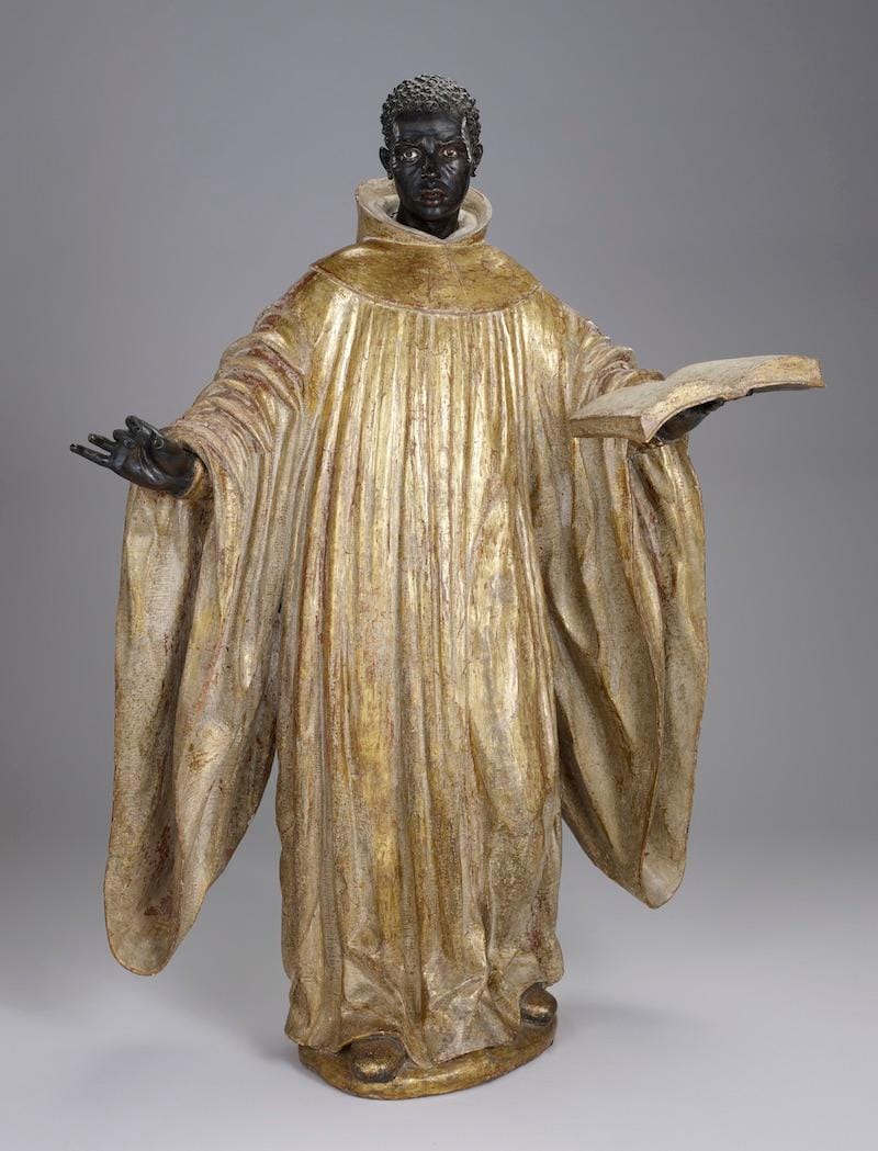 A spectacular wooden statue of St. Benedict of Palermo (1734) attributed to José Montes de Oca is among the show’s most striking objects. Benedict rose from poverty to become a leader of two different religious communities despite his dark skin; he was even enshrined in a tomb built by King Phillip III. Benedict commanded unprecedented respect for his humble piety, which allowed him to blend into the establishment. The great man’s intense religious conviction and righteous confidence is communicated in the sculpture’s dynamic pose and concentrated gaze.