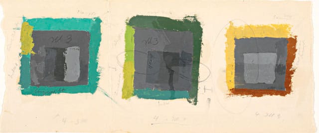“Three Color Studies for Homage to the Square” (not dated). Oil on blotting paper, 20.9 x 47.6 cm. © 2012 The Josef and Anni Albers Foundation / Artists Rights Society New York. Digital Image by Imaging 4 Art, inv. no. 1976.2.192.