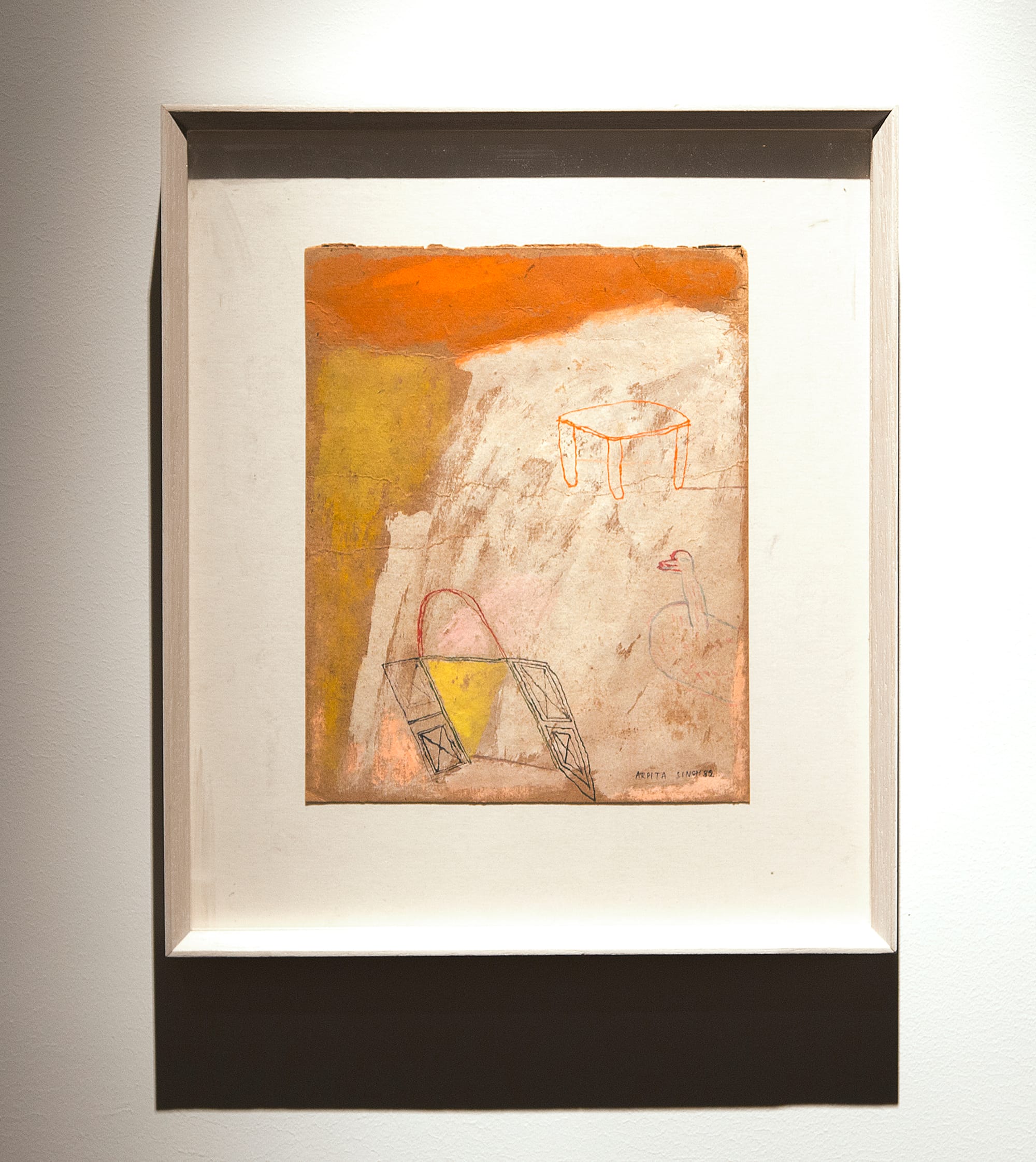 In at least one drawing, “Untitled” (1975), which is covered with a dense black ground, she scratches back into the paper, making vertical lines marked by dots reminiscent of beaded embroidery and scarification. In an earlier work, “Untitled” (1974), which is hung near nearby, she seems to have worked the paper so hard that it partly tore down the middle. She has taken the pieces of this “damaged” drawing and affixed them to a larger sheet. In the last drawing in the show, “Untitled” (1982), done in watercolor and poster paint on cardboard, Singh uses line to draw a table, a swan emerging from an abstract form, and an arched window with open shutters. Each thing occupies its own space and yet they all feel connected.